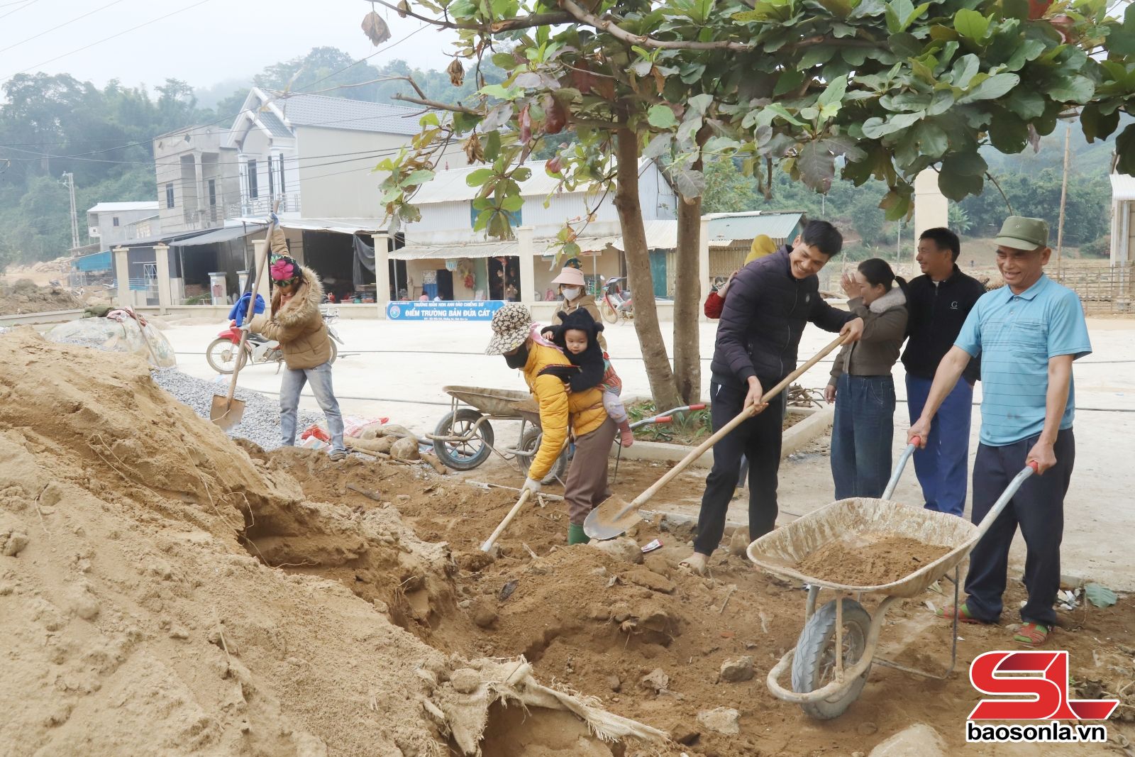 Phụ huynh học sinh điểm trường bản Đứa Cát, Trường Mầm non Anh Đào, xã Chiềng Sơ đóng góp ngày công sửa chữa khuôn viên điểm trường sau lũ.