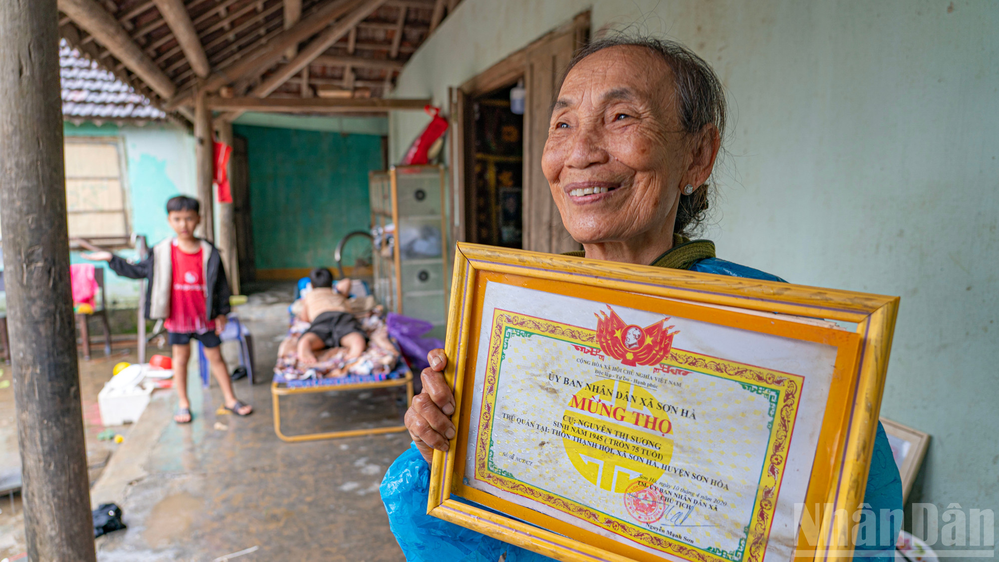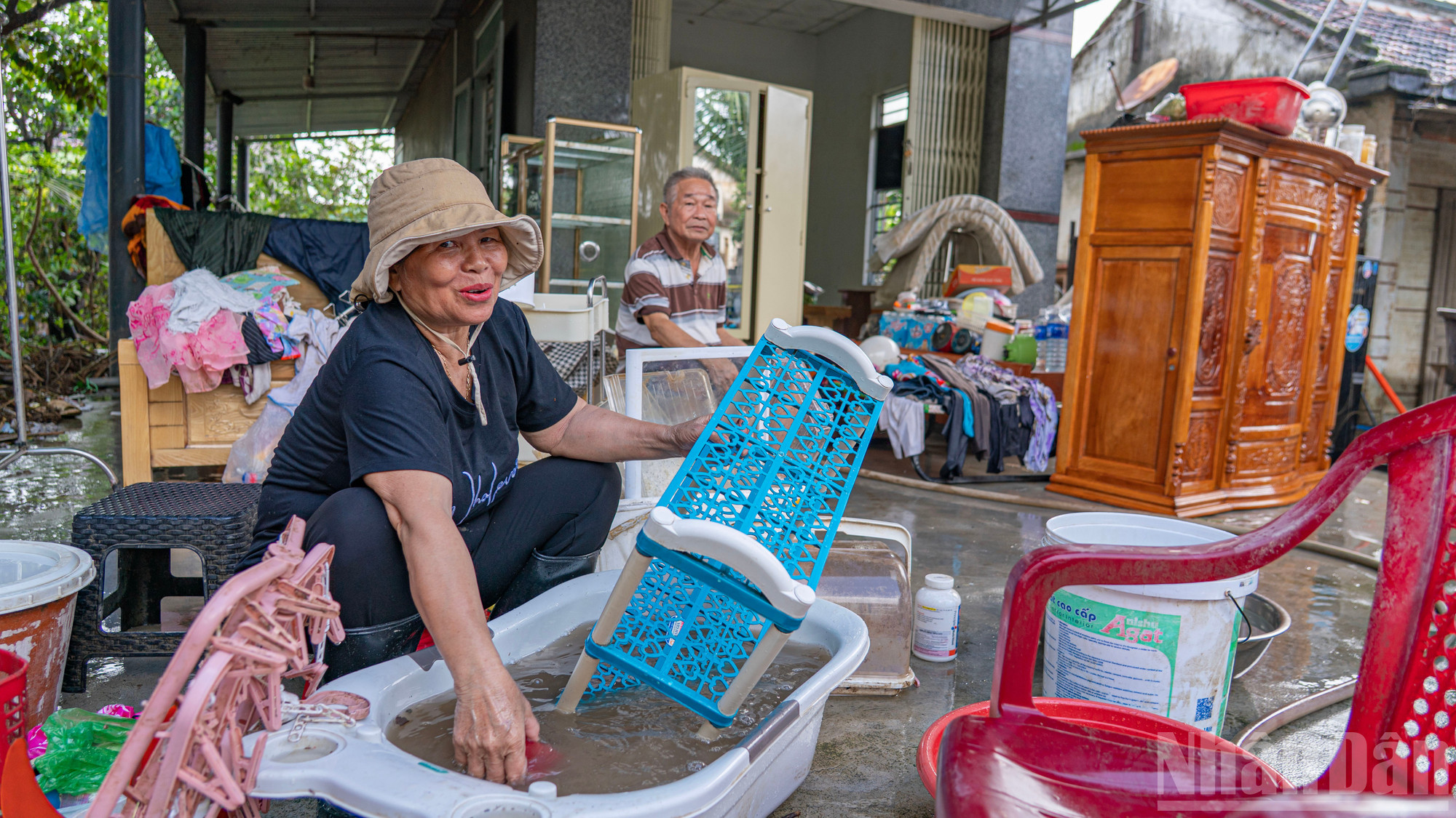 Cụ bà cười tươi khi dòng nước lũ vẫn để lại cho căn nhà vài bộ bát đĩa và tấm bảng "mừng thọ".