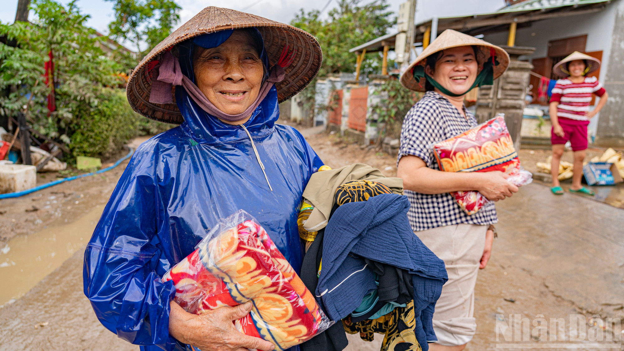 Những người phụ nữ tươi vui sau khi nhận quà cứu trợ từ các mạnh thường quân.