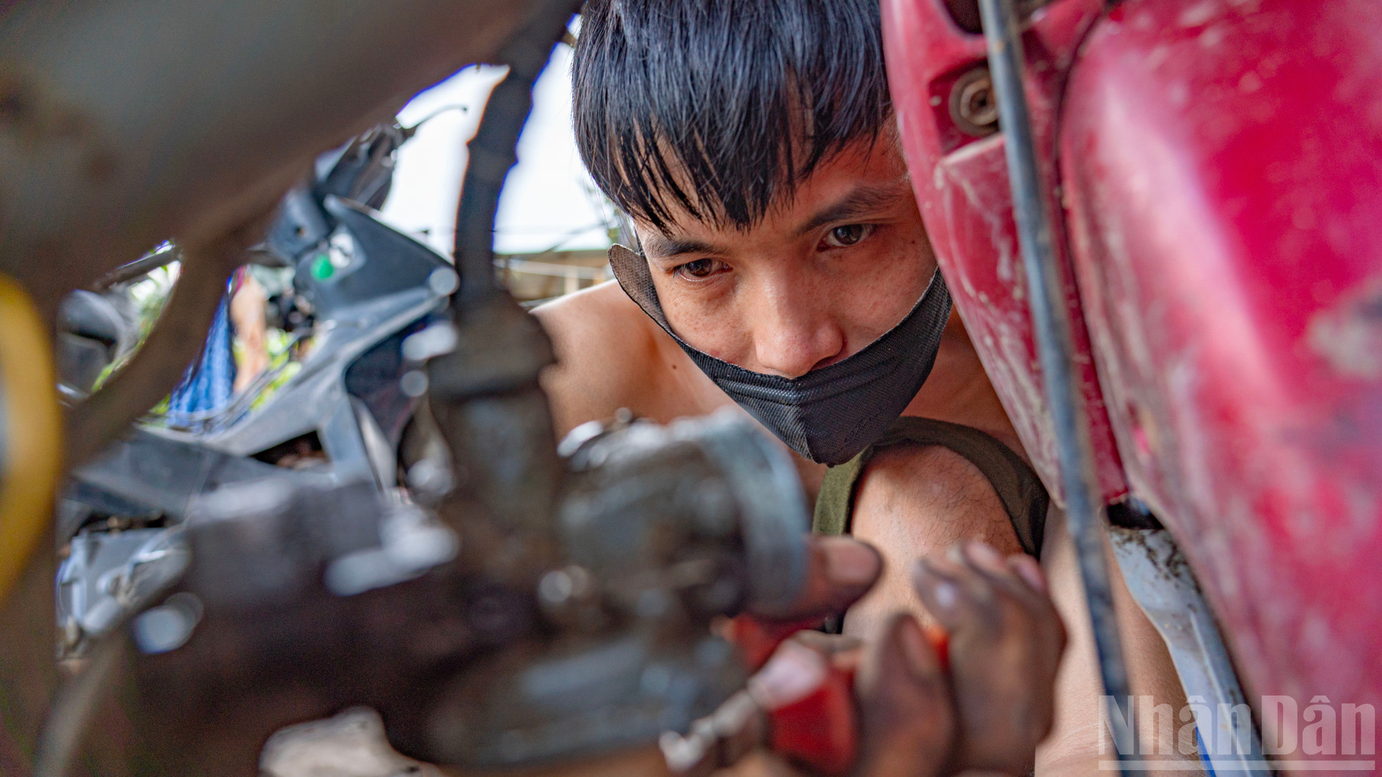 Bên trong một xưởng sửa chữa xe máy đang hoạt động "hết công suất" tại Thạnh Hội.