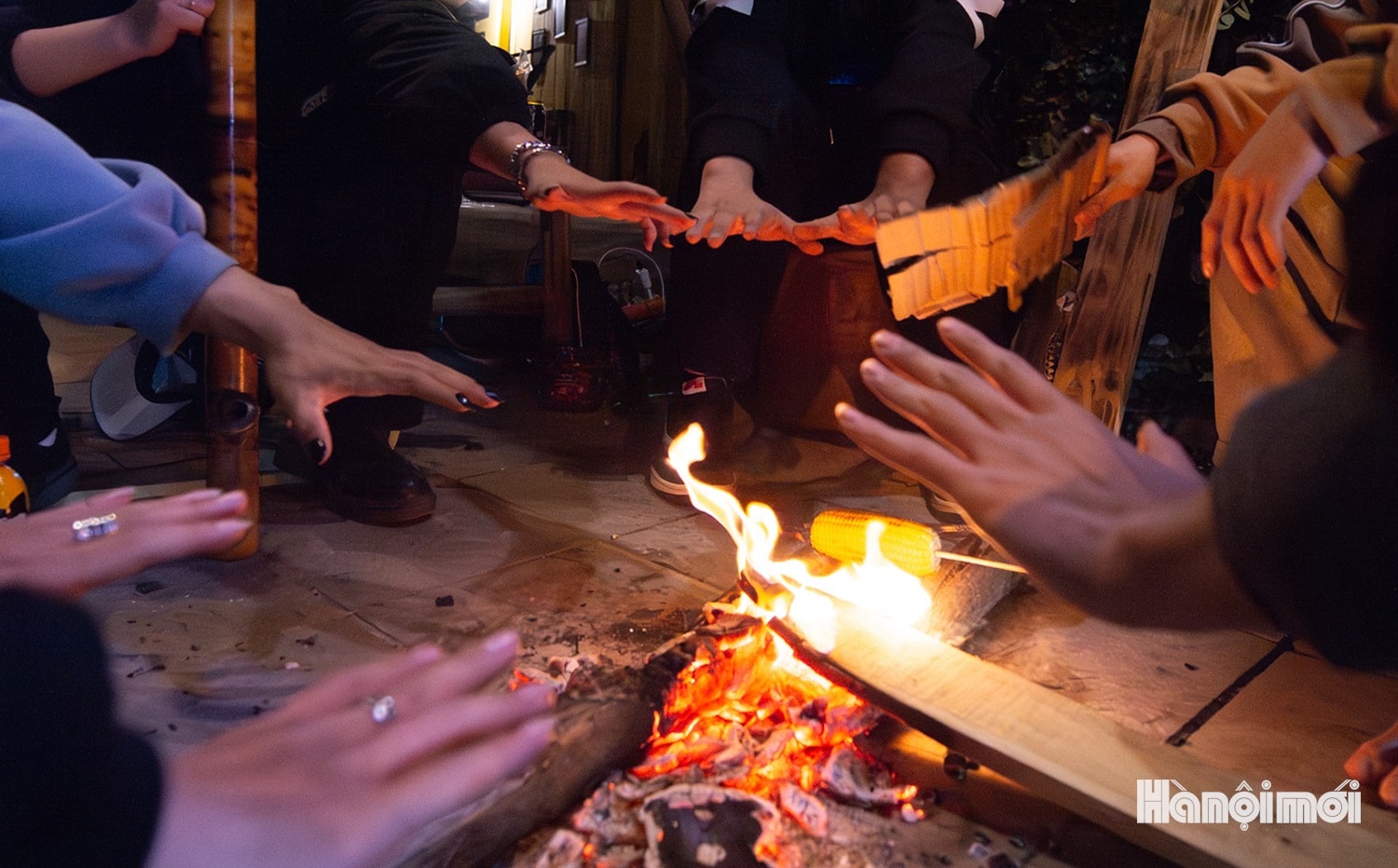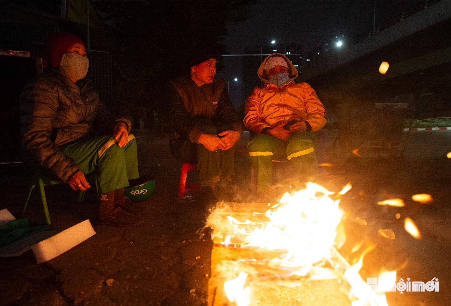Nhóm người đốt lửa sưởi ấm trong khi chờ đến giờ làm việc. Ảnh: Quang Thái