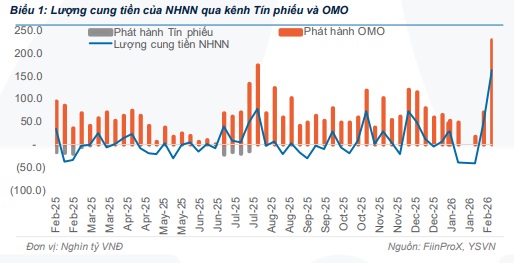 Theo đó, trong kỳ báo cáo của Yuanta Việt Nam, Ngân hàng Nhà nước (NHNN) tăng quy mô hỗ trợ thanh khoản rõ rệt qua kênh OMO (bơm - hút tiền). Tổng khối lượng phát hành đạt 229.8 nghìn tỷ đồng, tập trung ở các kỳ hạn 28ngày (95.8 nghìn tỷ), 56 ngày (68.1 nghìn tỷ) và 7 ngày (65.8 nghìn tỷ). Lượng đáo hạn ở mức 65.6 nghìn tỷ đồng, theo đó NHNN bơm ròng khoảng 164.2 nghìn tỷ đồng ra hệ thống. Quy mô OMO lưu hành tăng mạnh lên mức kỷ lục mới, 480.2 nghìn tỷ đồng.