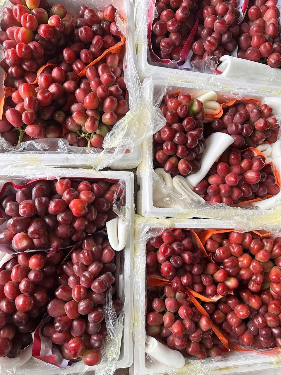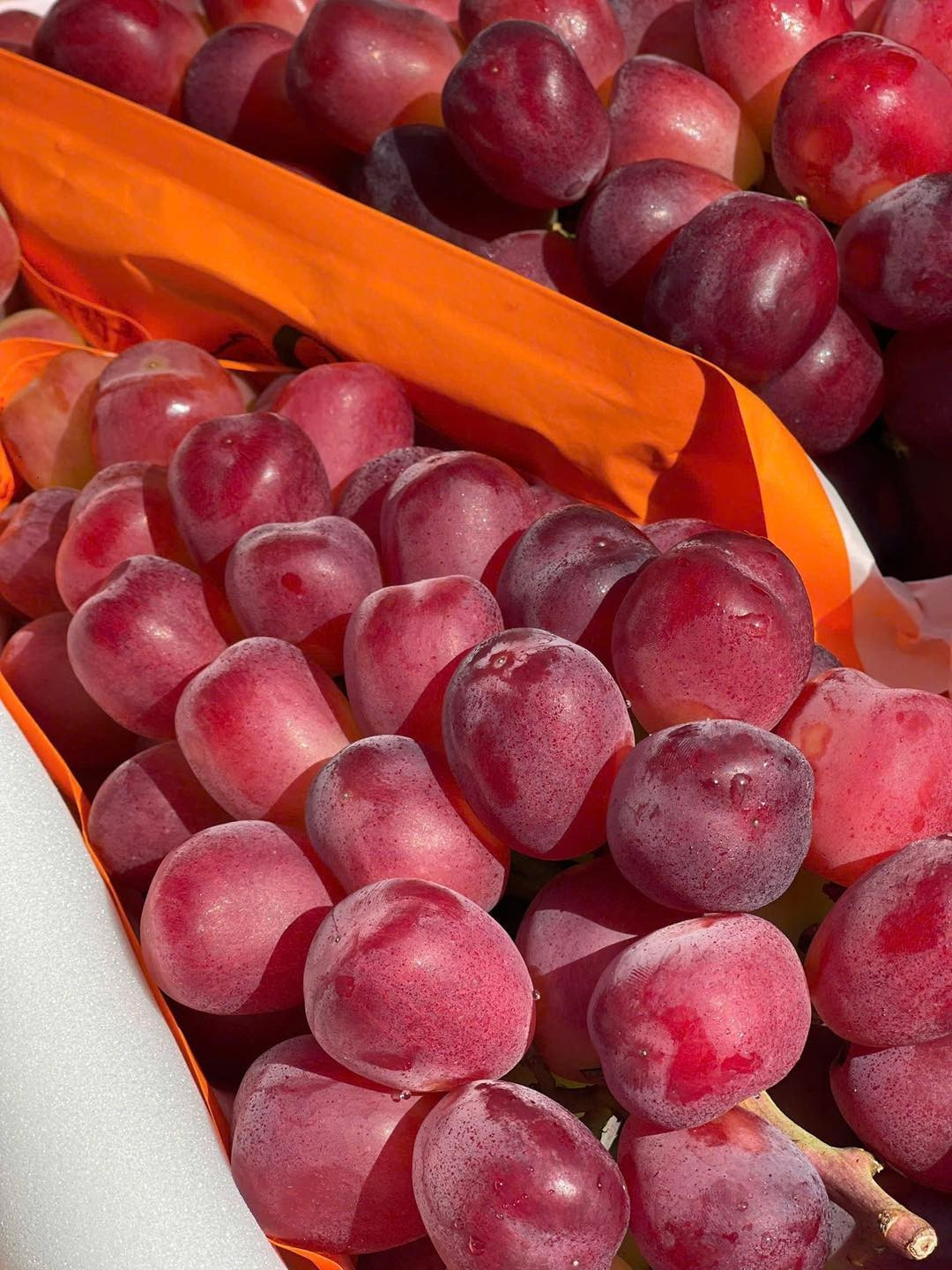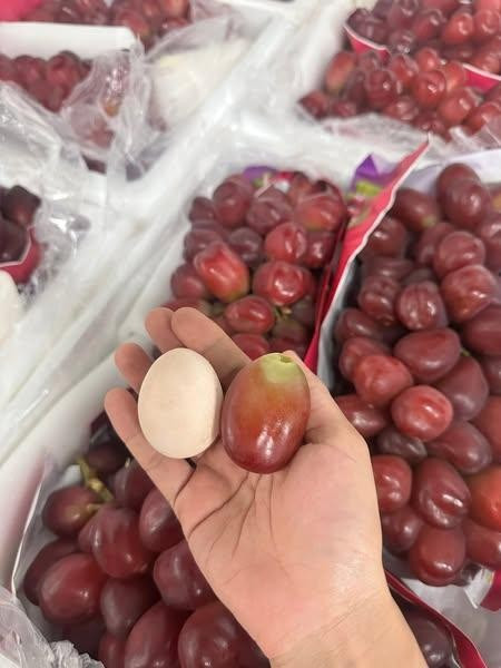 Bên cạnh nho sữa xanh, thời gian gần đây, nho sữa đỏ trái tim của Trung Quốc cũng được bày bán la liệt khắp chợ Việt. Ảnh: FB Trần Thị Huyền Trang