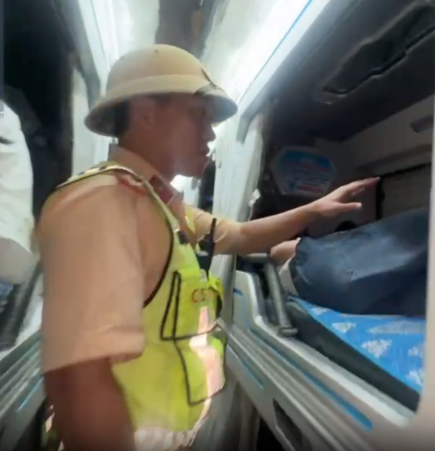 Cảnh sát giao thông kiểm tra xe chở khách vượt quá số người quy định.