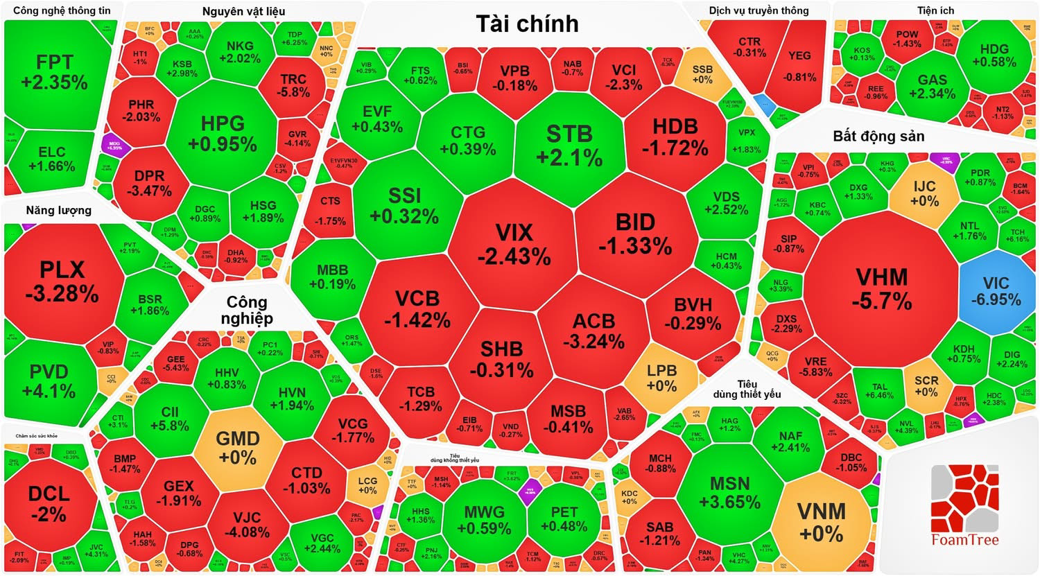 Nhóm cổ phiếu tài chính (ngân hàng, chứng khoán) cũng tiếp tục giảm: ACB giảm 3,24%, VCB giảm 1,42%, BID giảm 1,33%, HDB giảm 1,72%, TCB giảm 1,29%, TPB giảm 1,74%; VIX giảm 2,43%, VCI giảm 2,3%, SHS giảm 1,58%...