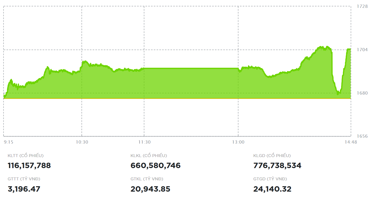 Chốt phiên, sàn HOSE có 162 mã tăng và 154 mã giảm, VN-Index tăng 27,33 điểm (+1,63%), lên 1.704,31 điểm. Tổng khối lượng giao dịch đạt hơn 776,7 triệu đơn vị, giá trị 24.140,3 tỷ đồng, tăng 17% về khối lượng và 36% về giá trị so với phiên hôm qua. Giao dịch thỏa thuận đóng góp hơn 118,4 triệu đơn vị, giá trị 3.228,8 tỷ đồng.