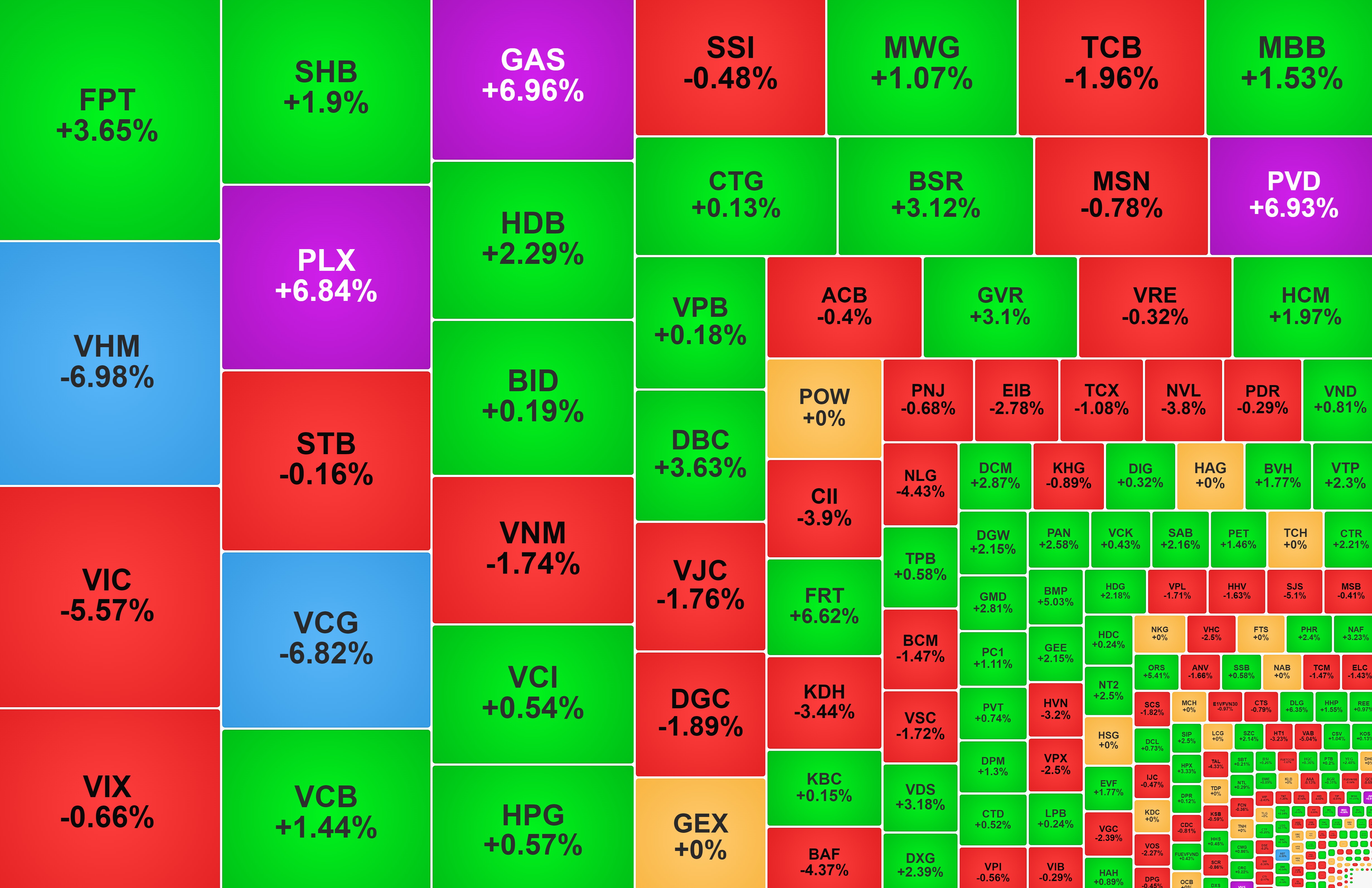 VN-Index giảm điểm hôm nay chủ yếu do nhóm Vingroup, với VHM giảm sàn, VIC -5,6%, VRE -0,3%. Các mã giảm đáng kể khác trong VN30 là DGC -1,9%, TCB -2%, VJC -1,8%, VNM -1,7%. Ngược chiều, nhiều mã bluechip tăng tốt, là trụ đỡ để thị trường không giảm sâu, như GAS và PLX cùng tăng trần, FPT +3,7%, GVR +3,1%, HDB +2,3%, SAB +2,2%, SHB +1,9%, VCB +1,5%...