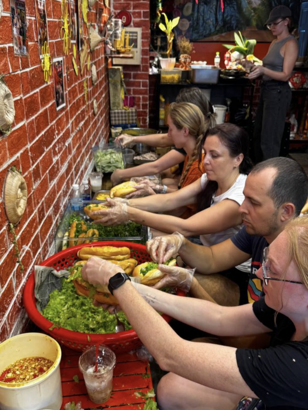 Nhóm có hơn 10 người, cùng ngồi trên một chiếc bàn dài để tiến hành dồn nguyên liệu vào bánh mì.