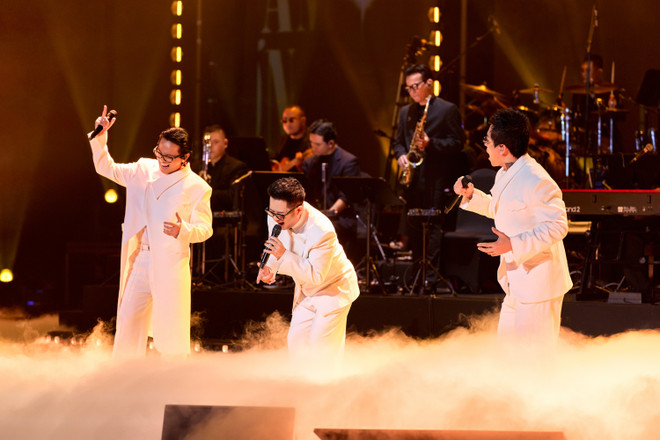 Ba thành viên Quả Dưa Hấu xuất hiện trong bộ tuxedo lịch lãm, trong tiếng reo hò của hàng trăm khán giả. (Ảnh: PV/Vietnam+)