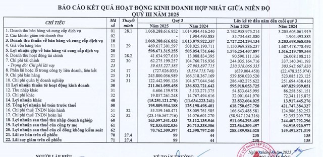 Theo báo cáo tài chính hợp nhất, doanh thu thuần quý III/2025 của DXG ghi nhận 1.068,2 tỷ đồng, tăng 5,4% so với cùng kỳ năm ngoái. Do giá vốn tăng cao nên lợi nhuận gộp thu về hơn 598,6 tỷ đồng, giảm 7%.