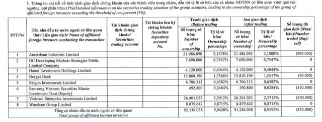 Cụ thể, quỹ Amersham Industries Limited bán 500.000 cổ phiếu, quỹ Norges Bank bán 50.000 cổ phiếu, quỹ Samsung Vietnam Securities Master Investment Trust [Equity] bán 102.000 cổ phiếu, quỹ Vietnam Enterprise Investments Limited bán 200.000 cổ phiếu.