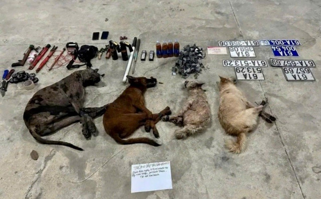 Tại hiện trường, cơ quan chức năng thu giữ ô tô, bốn con chó cùng nhiều dụng cụ dùng để trộm chó như súng bắn điện, bình xịt hơi cay, băng keo, mảnh thép chống truy đuổi, nhiều biển số xe và bột ớt...