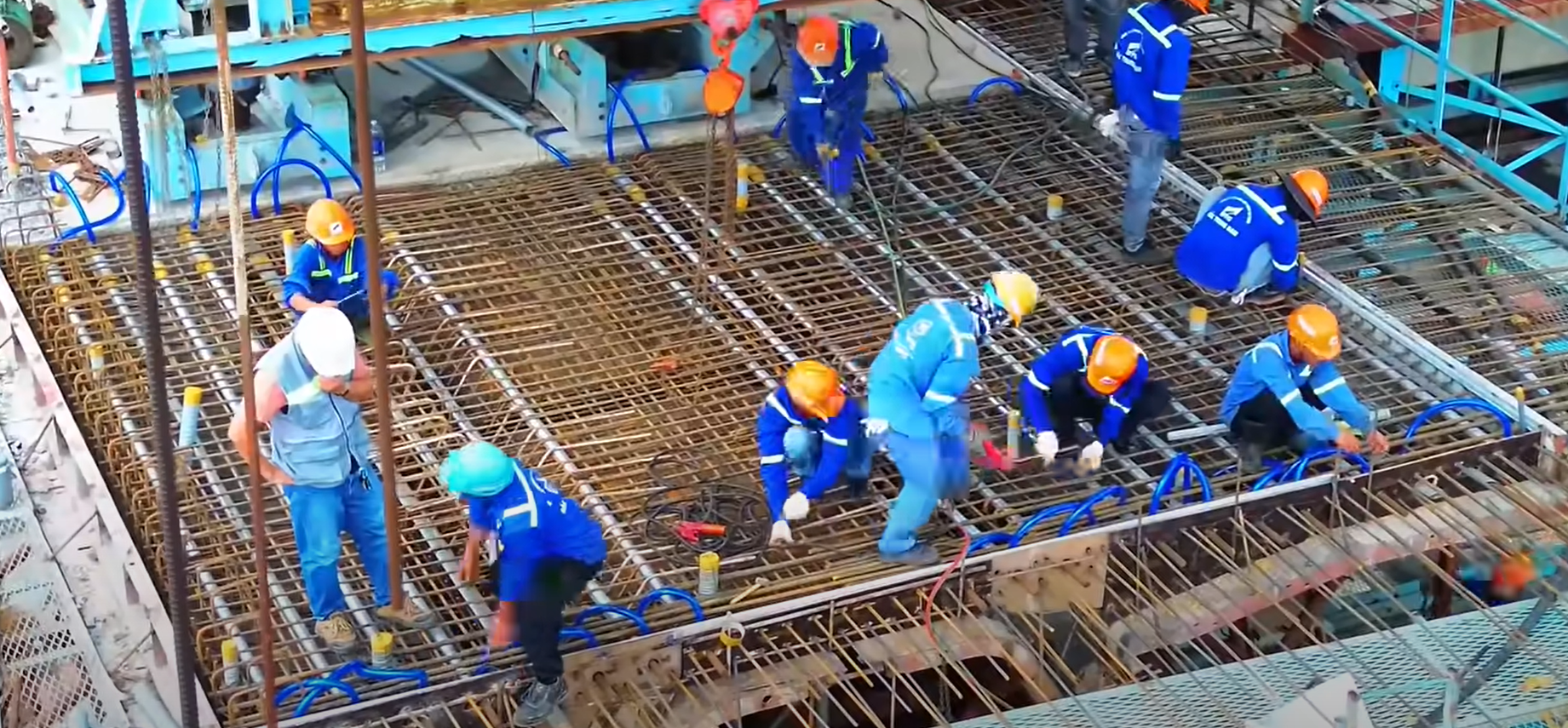 Các công nhân rải cốt sắt mặt cầu. Ảnh: Nhóm thợ cầu Việt Nam