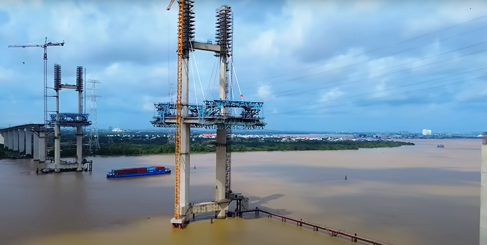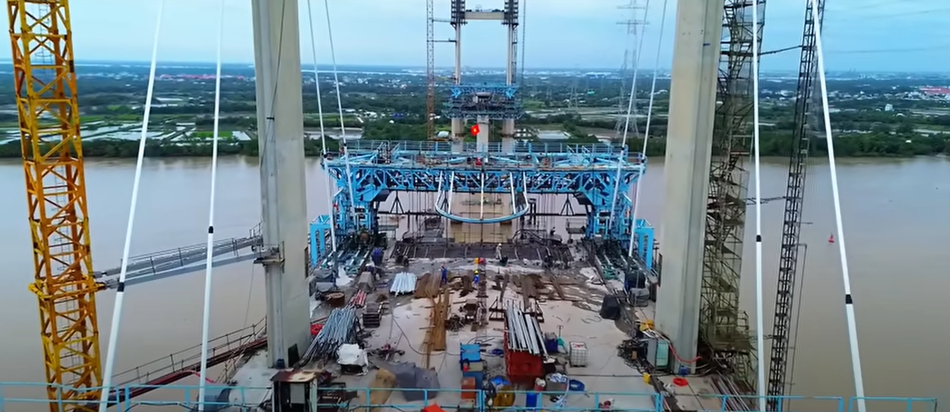 Phía trụ P15 bờ thành phố Hồ Chí Minh cũng đang được thi công rầm rộ. Ảnh: Nhóm thợ cầu Việt Nam