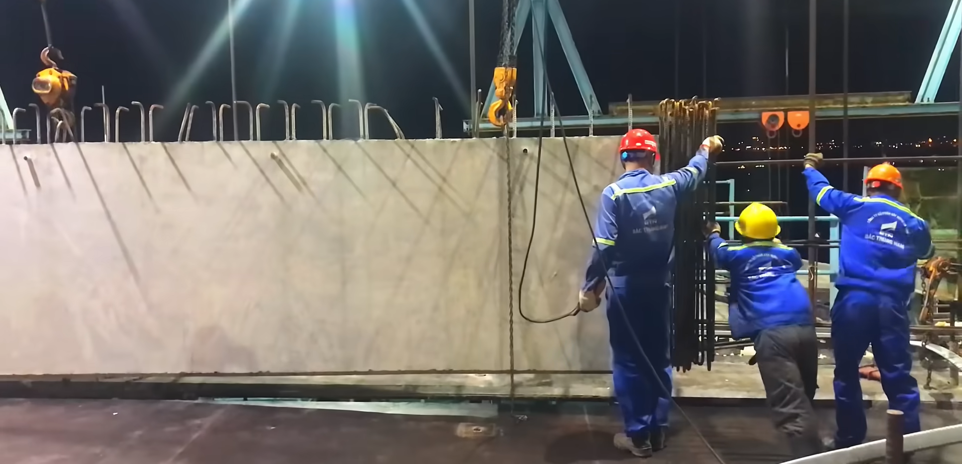 Công nhân bắt đầu rải sắt đổ bê tông mặt cầu. Ảnh: Nhóm thợ cầu Việt Nam