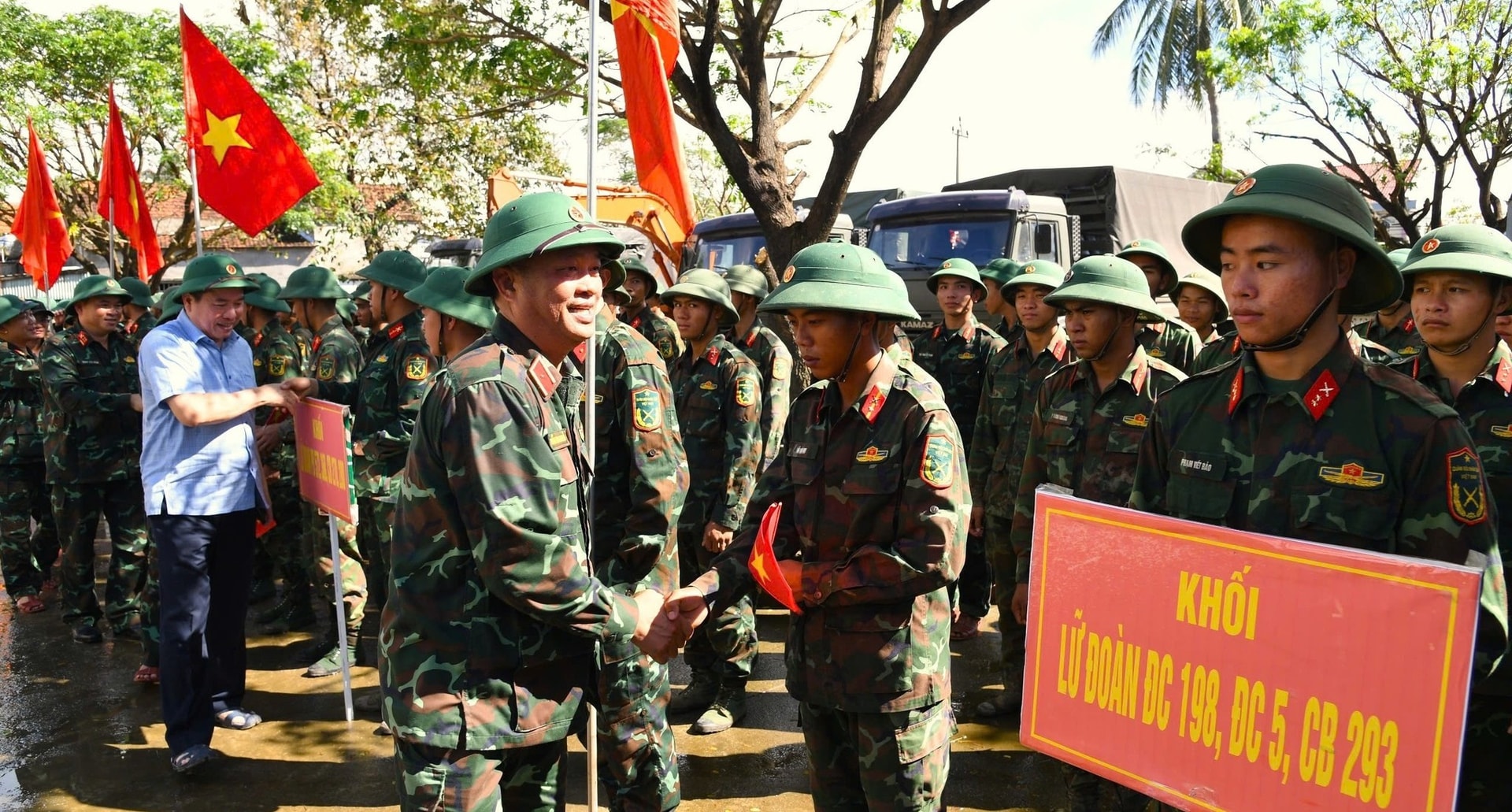 Quang cảnh Lễ ra quân triển khai Chiến dịch Quang Trung dựng lại nhà cho người dân vùng lũ do Quân khu 5 và UBND tỉnh Đắk Lắk tổ chức ngày 1-12-2025 tại xã Hòa Thịnh. Ảnh: Văn Viễn.