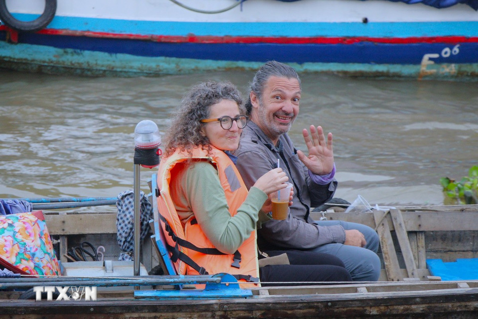 Du khách người nước ngoài tham quan chợ nổi.(Ảnh: Nguyễn Hằng/TTXVN)