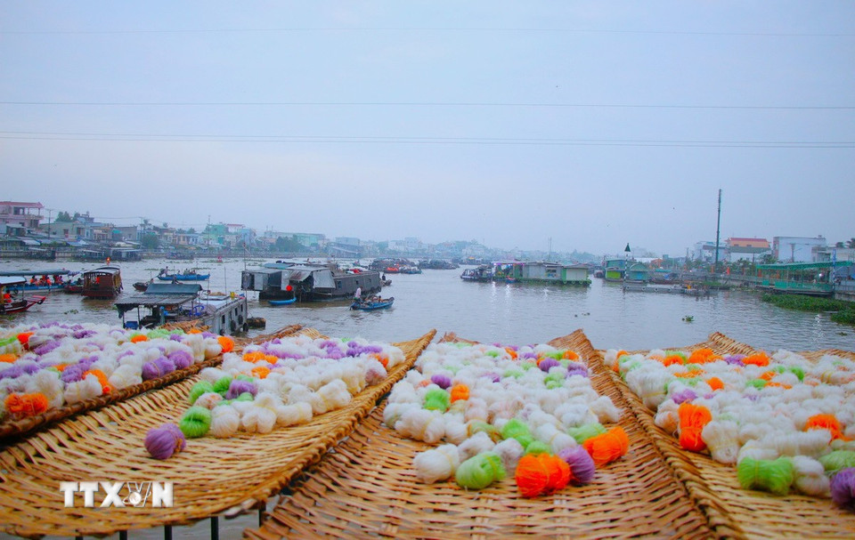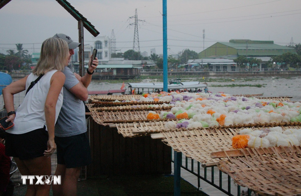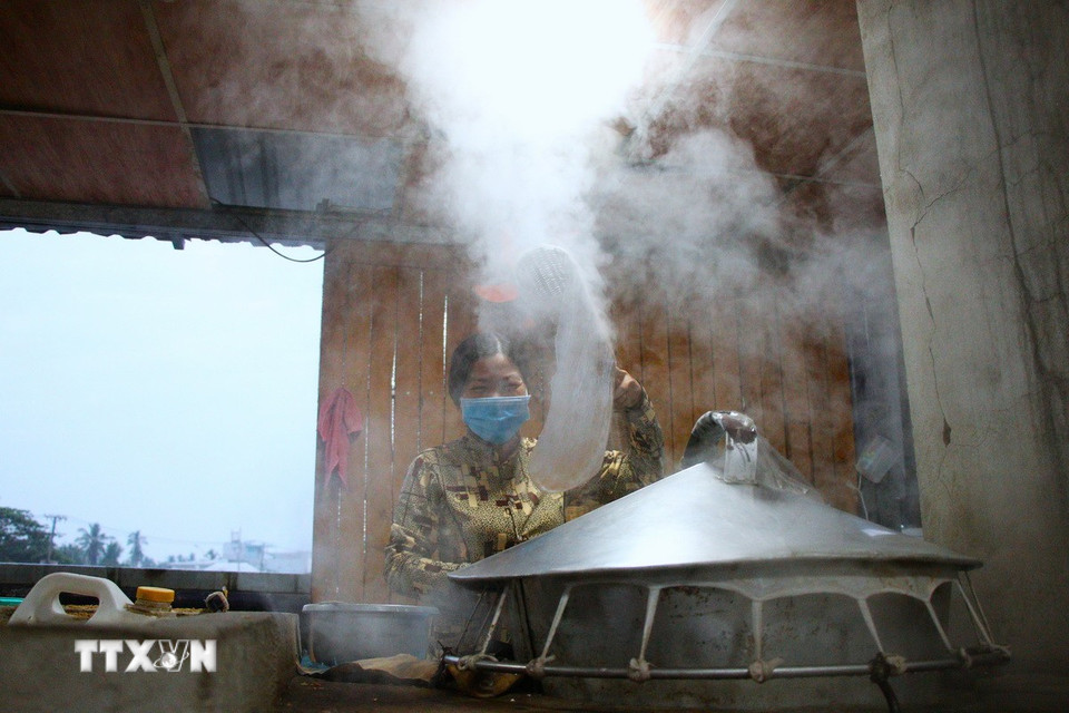 Đến với chợ nổi Cái Răng, du khách được tham quan, tìm hiểu về nghề làm bánh tráng truyền thống. (Ảnh: Nguyễn Hằng/TTXVN)