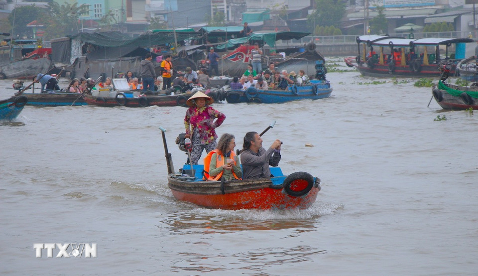 Du khách nước ngoài tham quan chợ nổi Cái Răng. (Ảnh: Nguyễn Hằng/TTXVN)