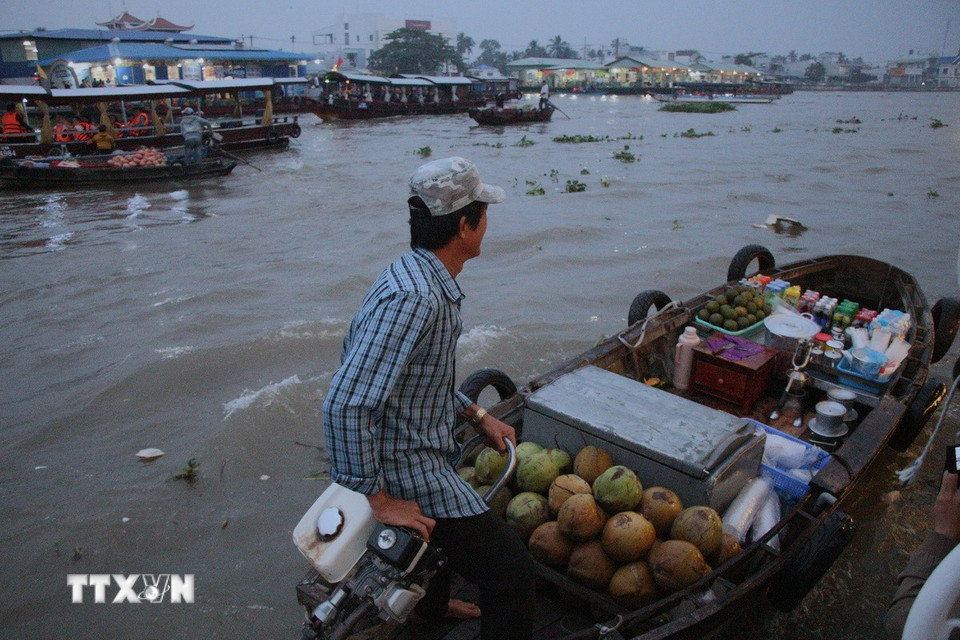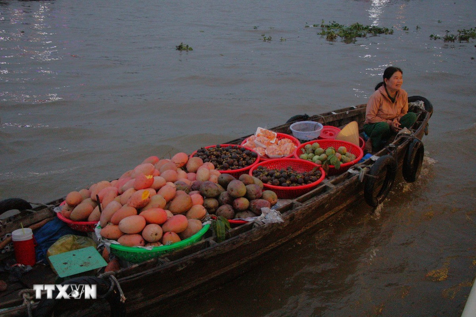 Nông sản được người dân chở ra chợ nổi bán vào rạng sáng. (Ảnh: Nguyễn Hằng/TTXVN)
