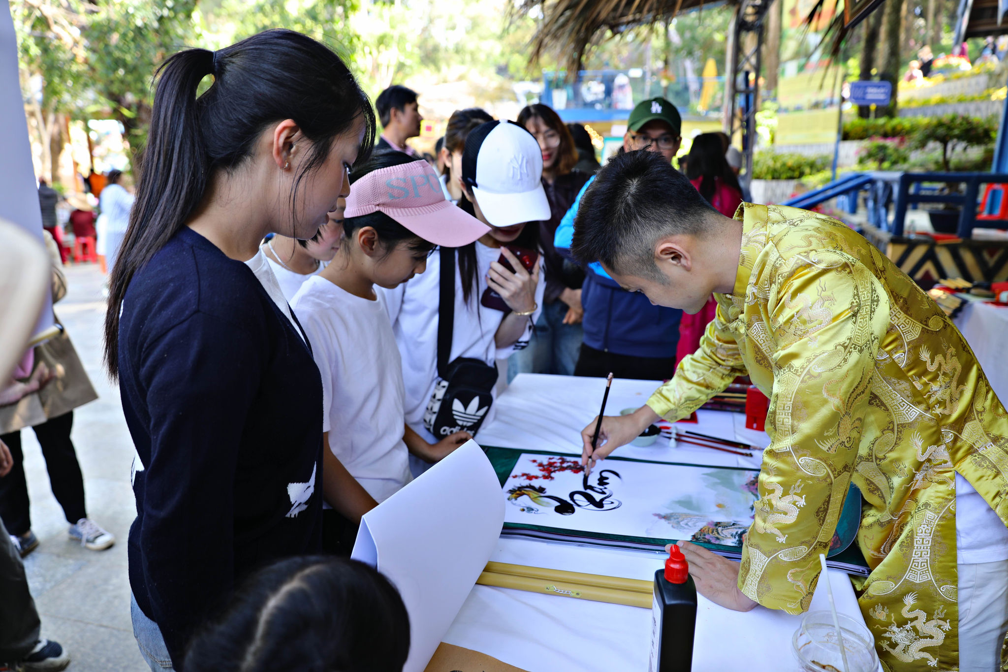 Song song đó, khu vực thư pháp và tranh dân gian cũng thu hút đông đảo người trẻ. Các ông đồ tỉ mỉ viết từng nét chữ trên giấy đỏ, gửi gắm những lời chúc về sức khỏe, bình an, học hành tấn tới. Nhiều bạn trẻ kiên nhẫn xếp hàng xin chữ, coi đây là một nét đẹp văn hóa cần được gìn giữ.