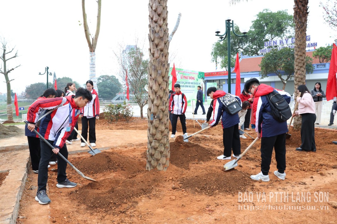 Các em học sinh trồng cây tại Công viên bờ sông Kỳ Cùng, phường Đông Kinh sáng 23/2/2026