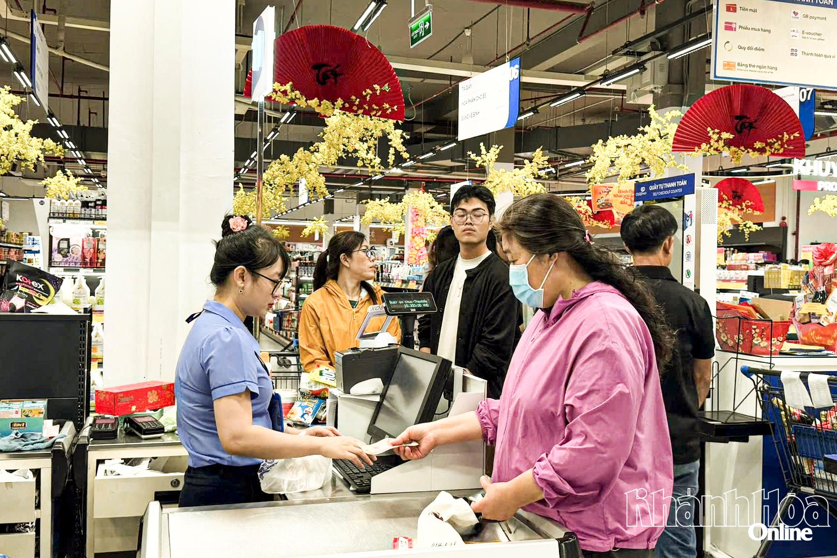 Theo ghi nhận, từ sáng 20-2 (mùng 4 Tết), các siêu thị: GO!, Lotte Mart Nha Trang (phường Tây Nha Trang), Co.opmart Thanh Hà (phường Phan Rang)... đã mở cửa trở lại với đầy đủ quầy kệ, nguồn hàng phong phú, trưng bày bắt mắt. Nhiều chương trình khuyến mãi đầu xuân được triển khai, thu hút người dân mua sắm khá đông, tập trung vào các mặt hàng thực phẩm tươi sống, đồ khô, bánh kẹo và nhu yếu phẩm. Bà Nguyễn Thị Ánh Đào - Giám đốc Siêu thị Co.opmart Thanh Hà (phường Phan Rang) cho biết: “Ngay từ những ngày đầu năm, đơn vị chủ động mở cửa sớm, chuẩn bị đầy đủ nguồn hàng thiết yếu phục vụ người dân. Sức mua sau Tết tăng trở lại, tập trung vào thực phẩm tươi sống, rau củ, hàng tiêu dùng nhanh; giá bán được giữ ổn định theo chương trình bình ổn nên người dân yên tâm mua sắm”.
