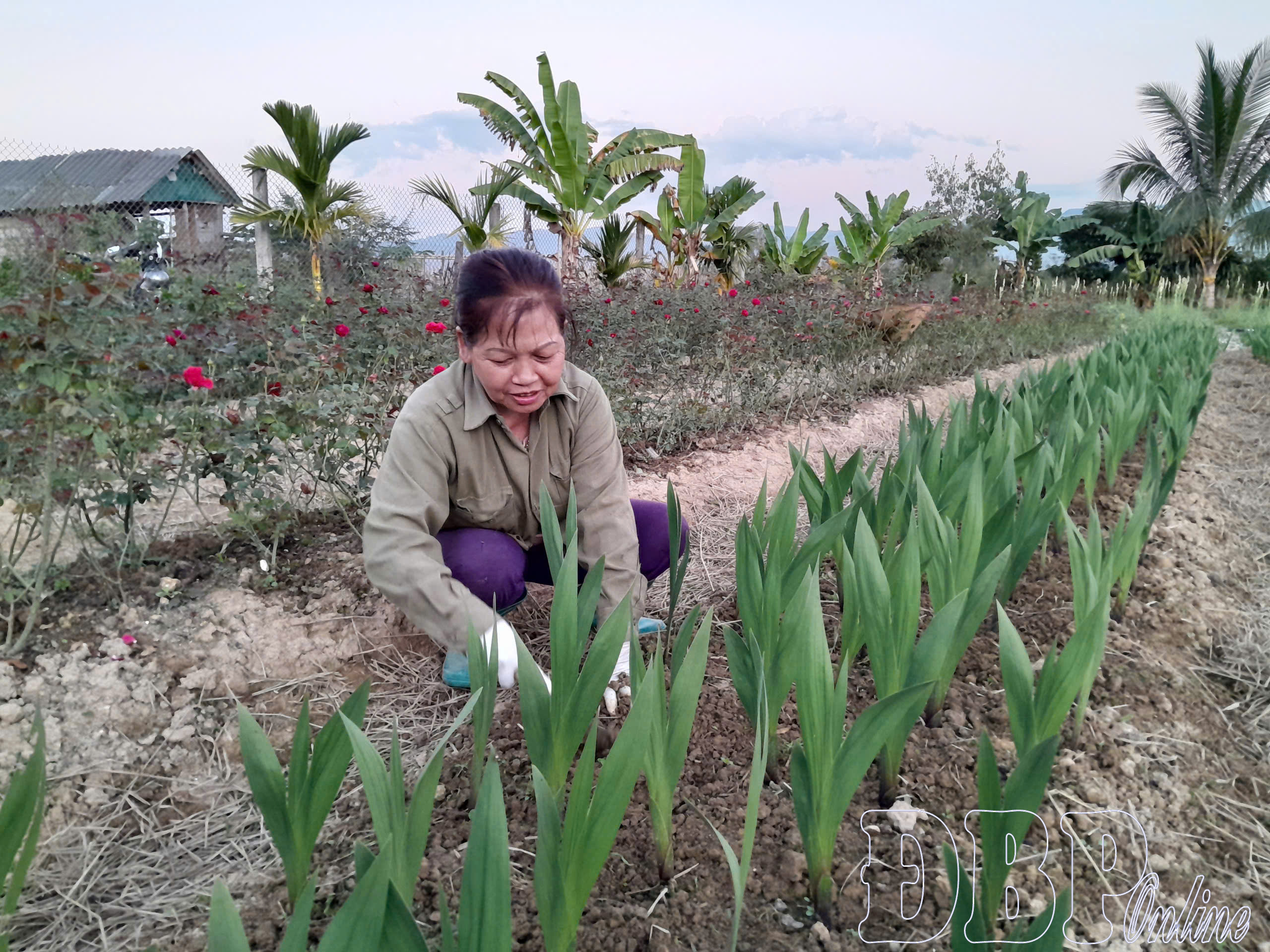 Bà Nguyễn Thị Bảy chăm sóc vườn hoa, phục vụ thị trường Tết.