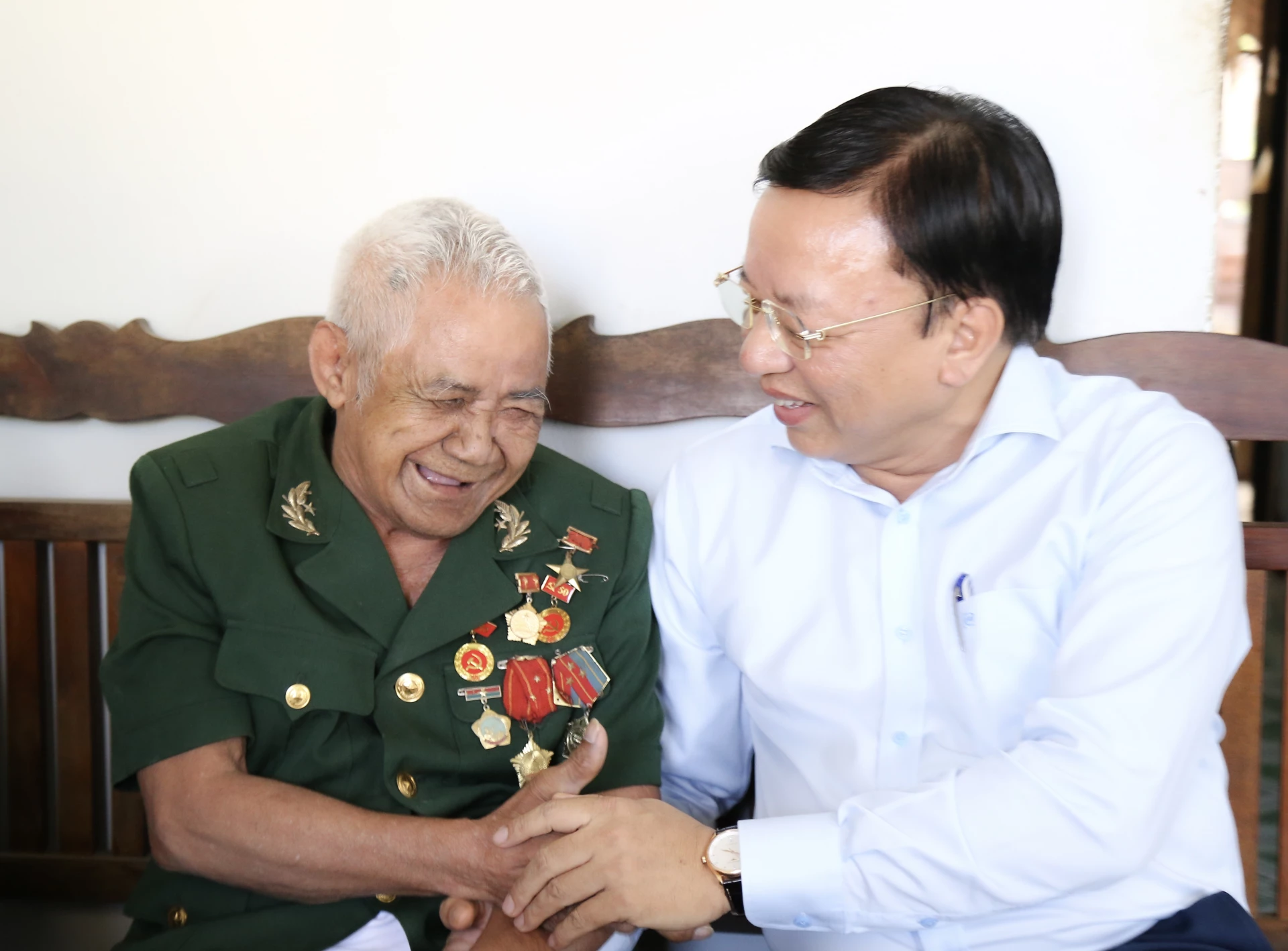Anh hùng Lực lượng vũ trang nhân dân Bo Bo Tới trò chuyện cùng đồng chí Lê Huyền - Phó Chủ tịch UBND tỉnh.