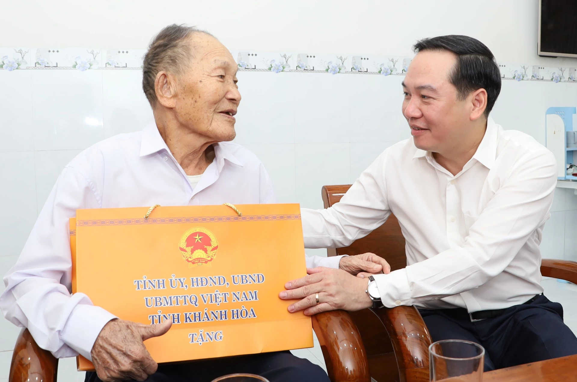 Đồng chí Nghiêm Xuân Thành - Ủy viên Trung ương Đảng, Phó Chủ nhiệm Ủy ban Kiểm tra Trung ương, Trưởng đoàn Đại biểu Quốc hội tỉnh Khánh Hòa, nguyên Bí thư Tỉnh ủy Khánh Hòa tặng hoa chúc mừng Anh hùng Lực lượng vũ trang nhân dân Cao Minh Nhạn.