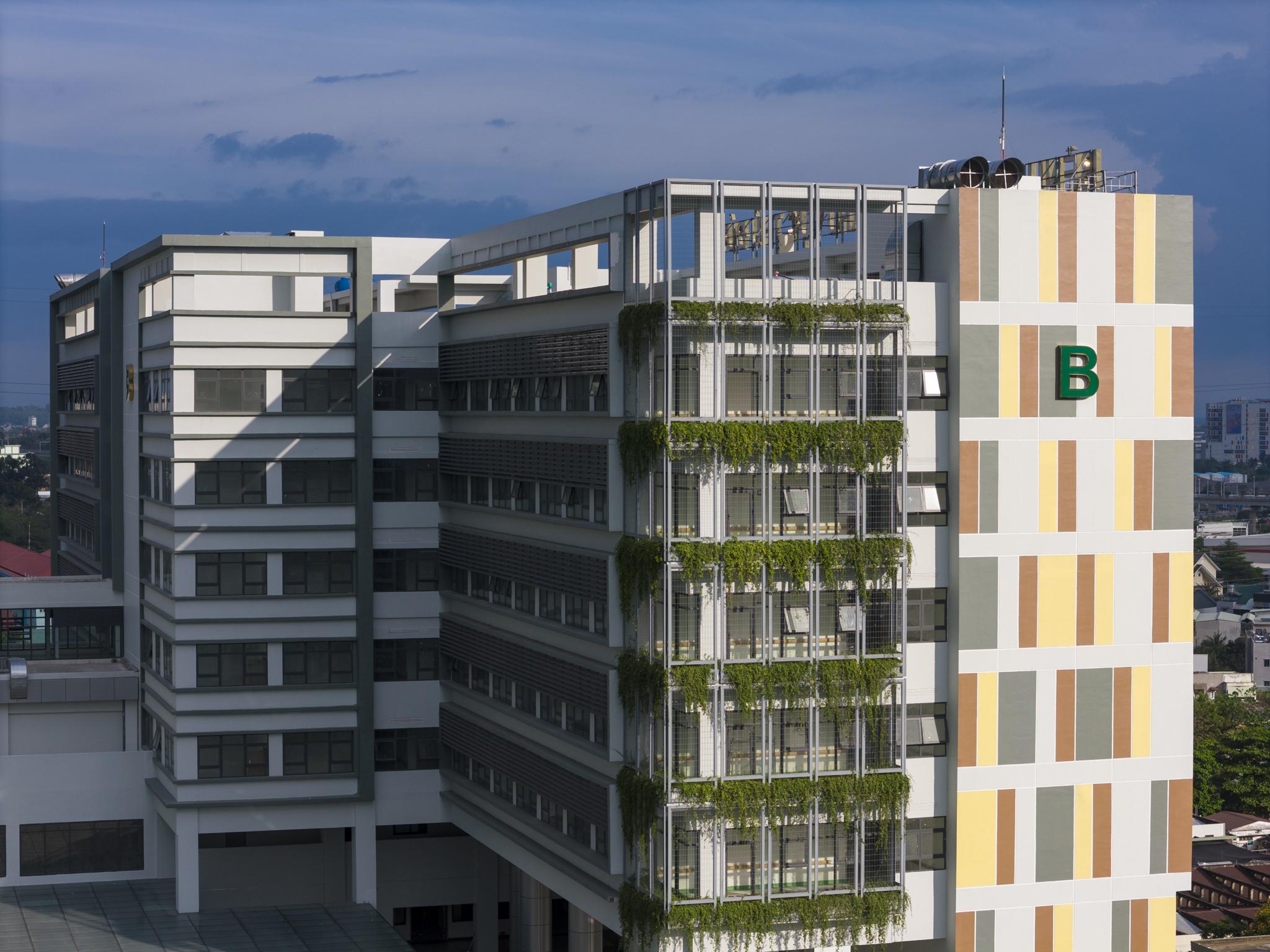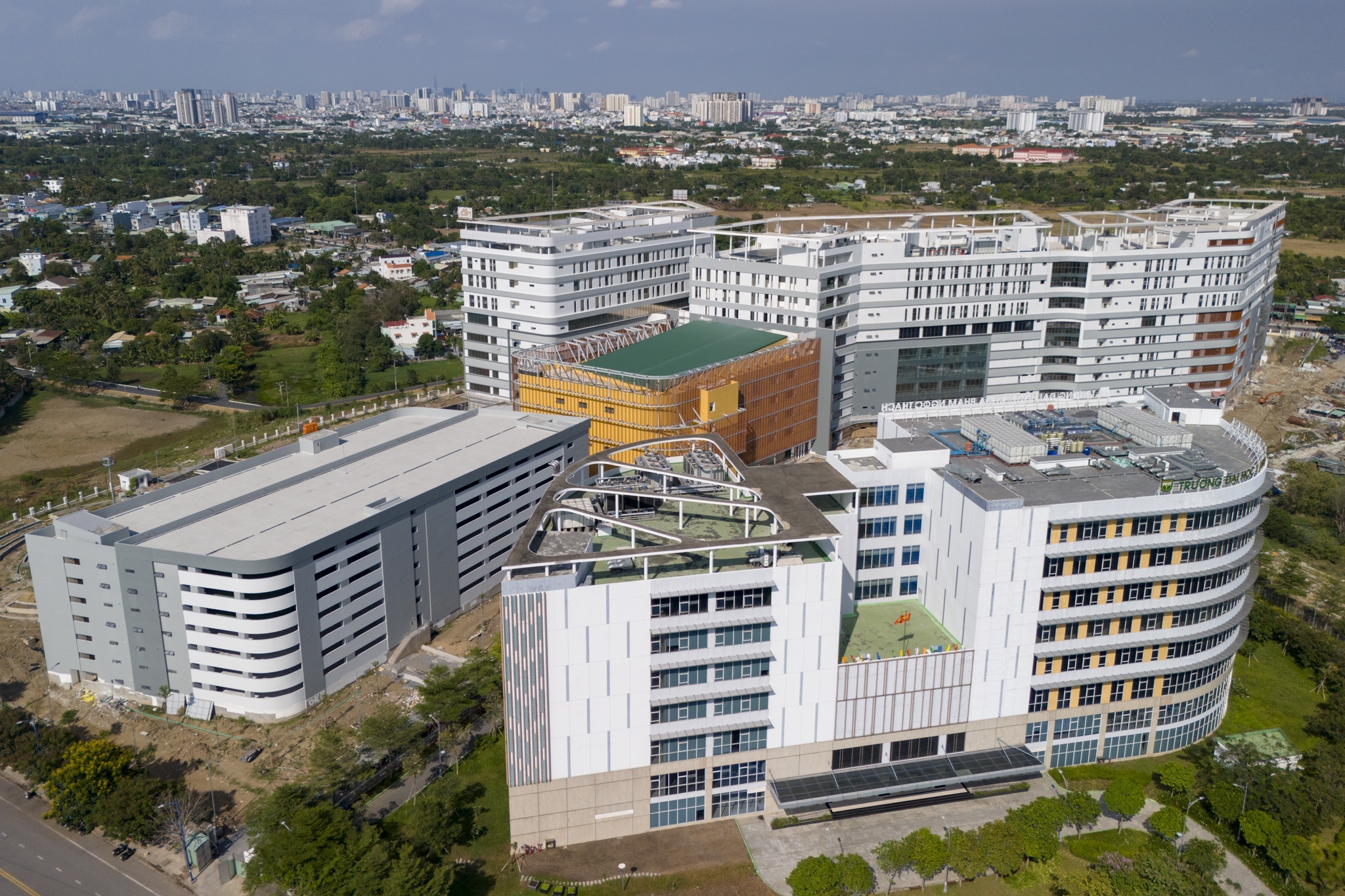 Thay vì những khối bê tông khô cứng, bệnh viện được thiết kế tràn ngập sức sống với khu cảnh quan xanh mát rộng 6.200 m² được bố trí ngay trên tầng 3. Không gian được ví như một công viên mini trên cao, với lối đi tản bộ và hàng ghế, tạo sự thư thái, xoa dịu người bệnh và thân nhân trong suốt quá trình điều trị.