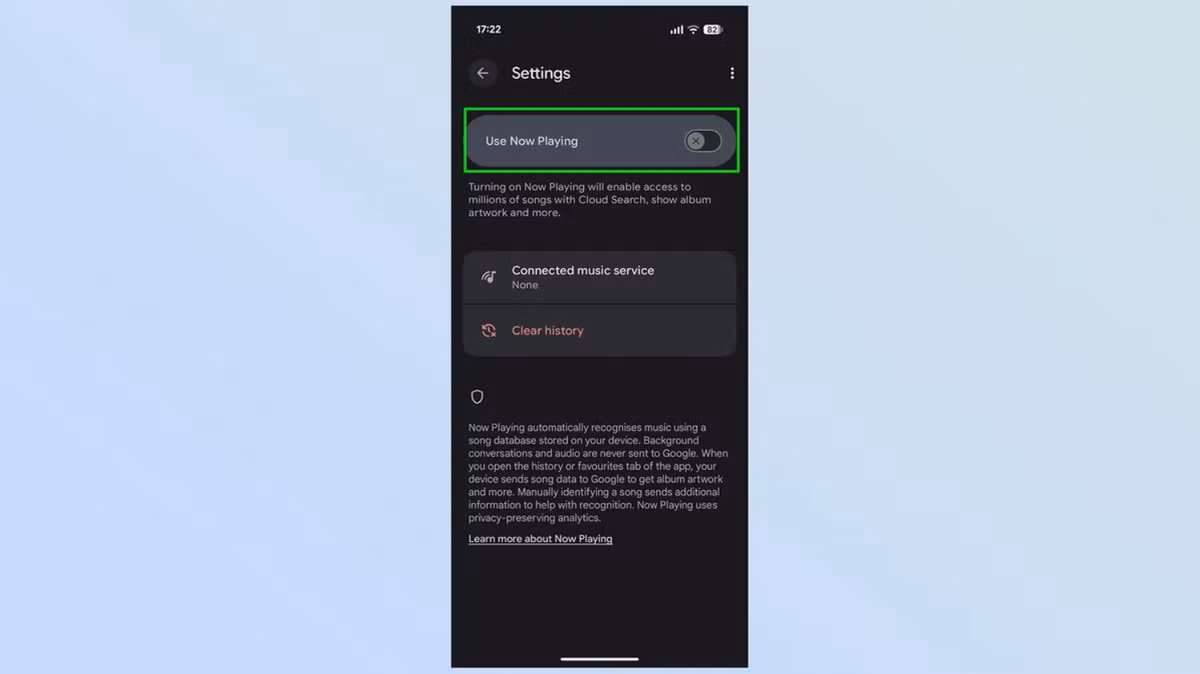 Để tắt chế độ này, người dùng cần vào Cài đặt (Settings) > Màn hình (Display) > Màn hình khóa (Lock Screen) > Đang phát (Now Playing) và tắt tùy chọn "Nhận diện bài hát đang phát gần đây". Nếu điện thoại Pixel có ứng dụng Now Playing, bạn có thể mở ứng dụng đó, sau đó vào menu cài đặt và tắt tùy chọn "Use Now Playing".