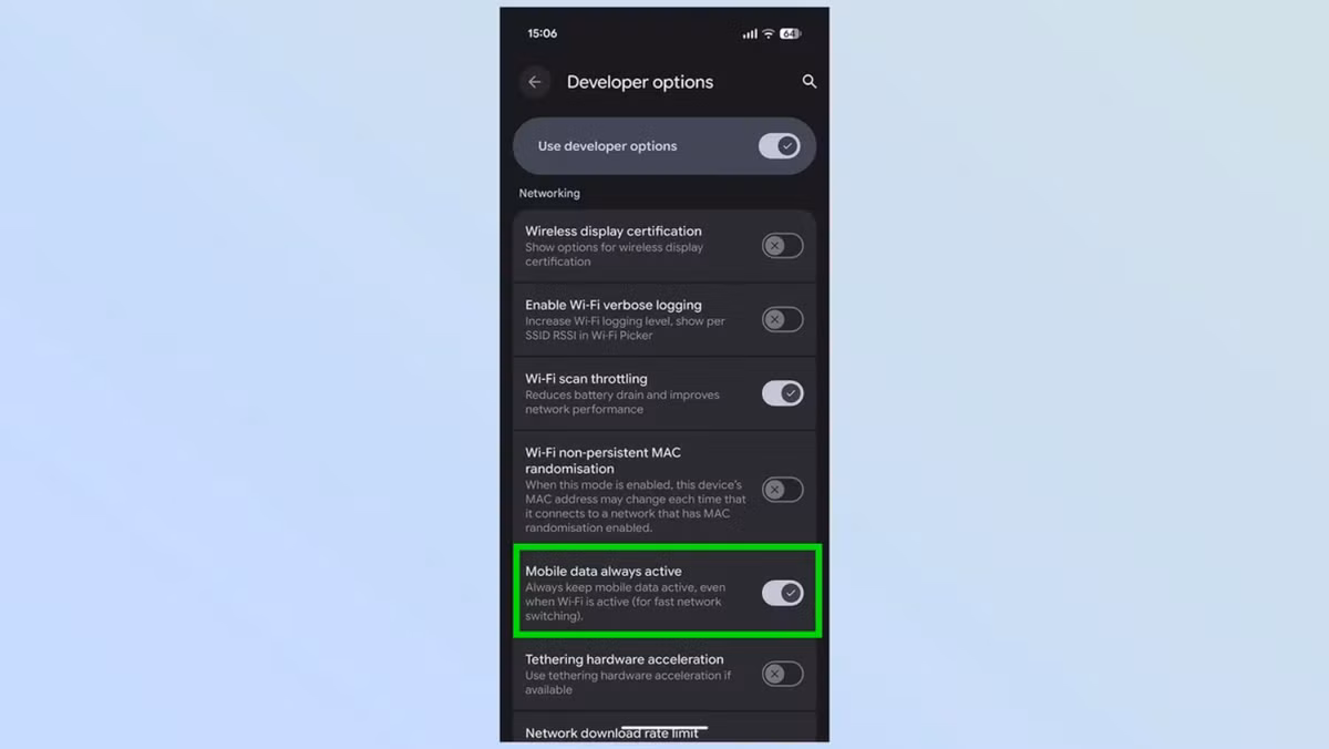 Hãy vào Cài đặt (Settings) > Hệ thống (System) > Tùy chọn nhà phát triển (Developer Options) > Dữ liệu di động luôn hoạt động (Mobile data always active), sau đó tắt cài đặt đó.