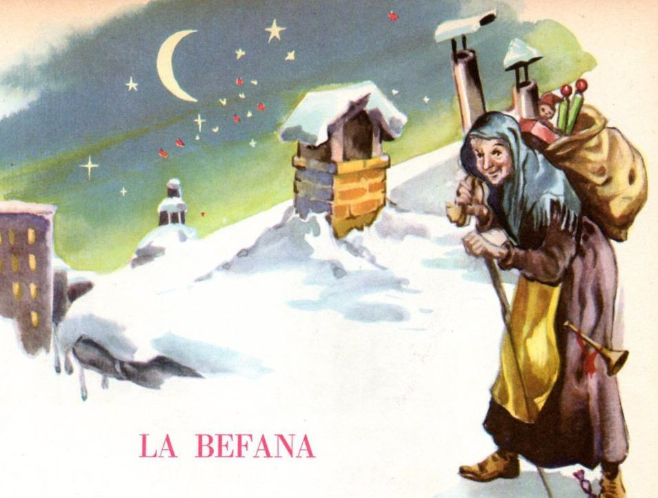 La Befana – bà lão phát quà trong văn hóa Ý. Befana cưỡi chổi mang quà cho trẻ em vào đêm 5/1, từng là nhân vật trung tâm mùa lễ trước khi Giáng sinh quốc tế hóa mạnh mẽ. Ảnh: Pinterest.