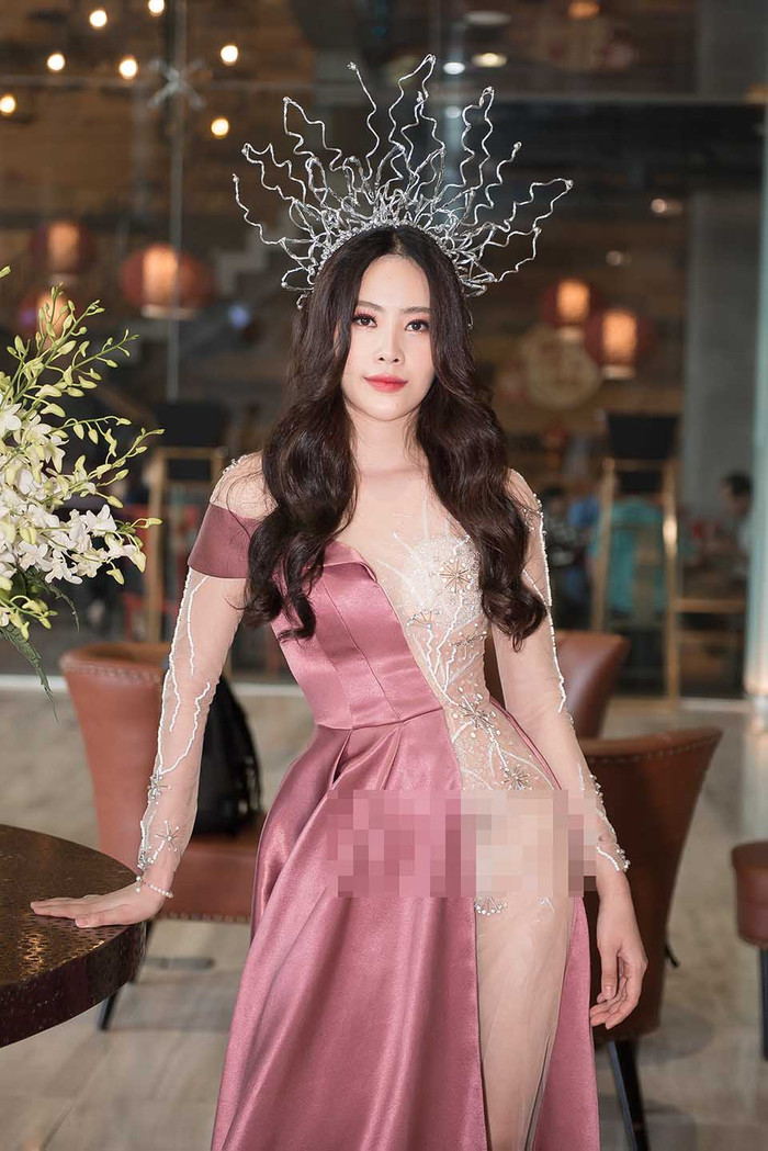 Bộ đồ mà Nam Em lựa chọn đầu năm nay lấy cảm hứng từ phong cách Barbiecore với tông hồng chủ đạo. Chiếc đầm có phom cúp ngực và chân váy tùng xòe phối tulle. Điểm nhấn của trang phục là những khoảng cắt khoét táo bạo ở phía sau lưng và hai bên eo, tạo hiệu ứng sexy rõ rệt.
