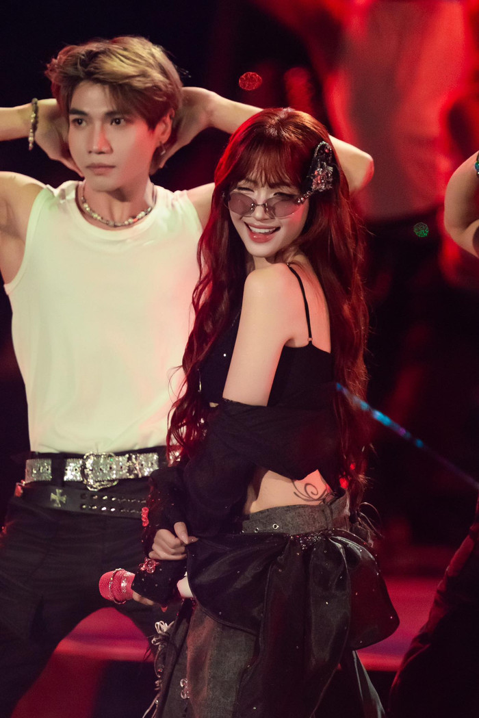 Trên sân khấu, Hòa Minzy đưa khán giả đi qua hành trình âm nhạc gắn liền với sự nghiệp của mình khi lần lượt tái hiện loạt bản hit quen thuộc như Bật tình yêu lên, Nàng tiên cá, Rời bỏ, Không thể cùng nhau suốt kiếp, Thị Mầu, Bắc Bling… Mỗi tiết mục đều được dàn dựng chỉn chu, mang đậm dấu ấn cảm xúc và phong cách riêng của nữ ca sĩ. Ảnh: FBNV