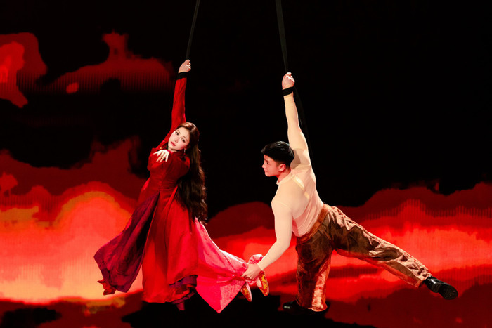 Hòa Minzy được treo lơ lửng trên không trung trong chiếc đầm đỏ lộng lẫy, ánh đèn và khói bao quanh. Bộ váy đỏ rực rỡ với hiệu ứng ánh sáng LED ẩn bên trong lớp vải không chỉ tạo nên sự hoành tráng mà còn giúp nữ ca sĩ trở thành tâm điểm tuyệt đối khi bay lượn trên không trung. Ảnh: FBNV