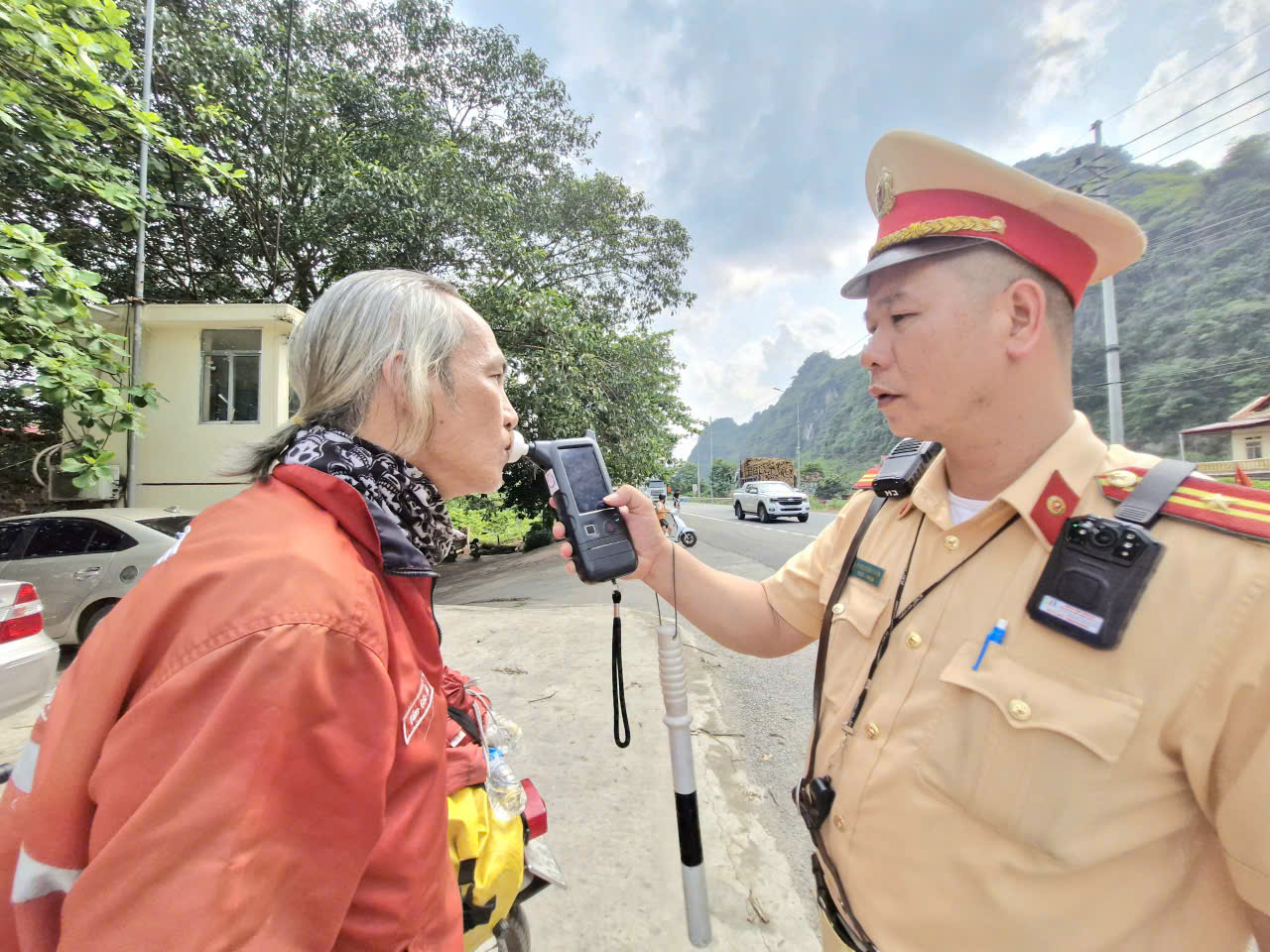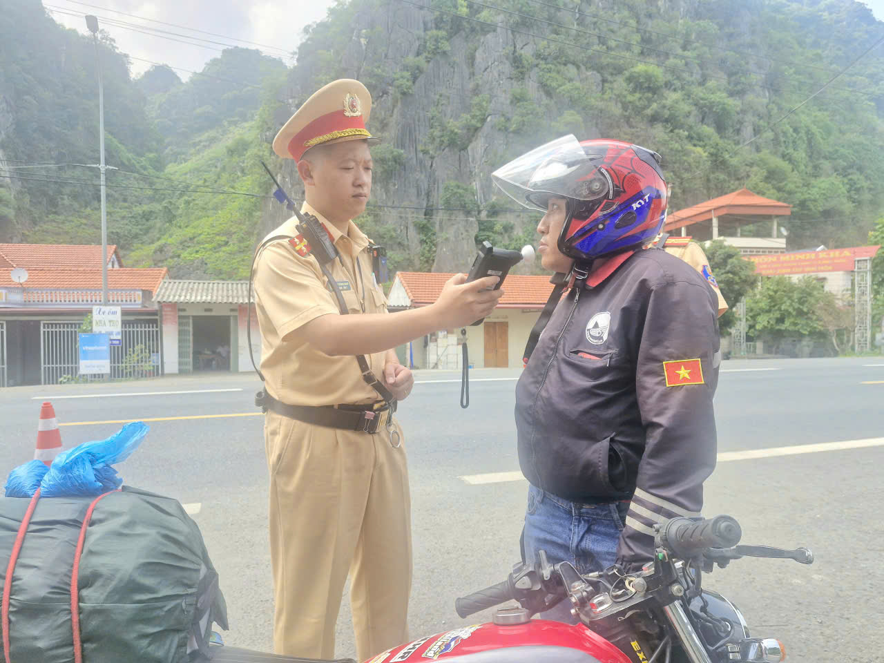Tổ công tác Trạm CSGT Tùng Diễn, Phòng CSGT Công an tỉnh Lạng Sơn kiểm tra nồng độ cồn đối với du khách.