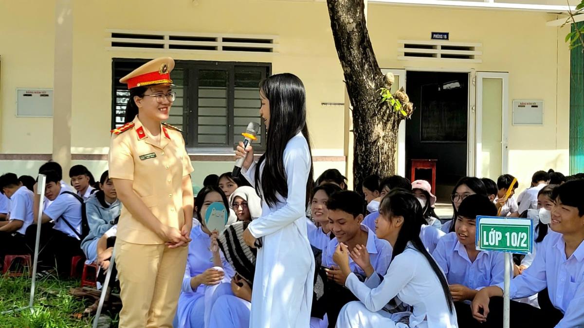Đại úy Trần Phạm Khánh Hoàng được đồng đội gọi trìu mến là "nữ tuyên truyền viên của an toàn giao thông".