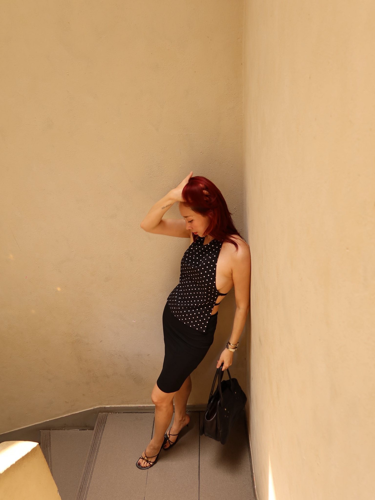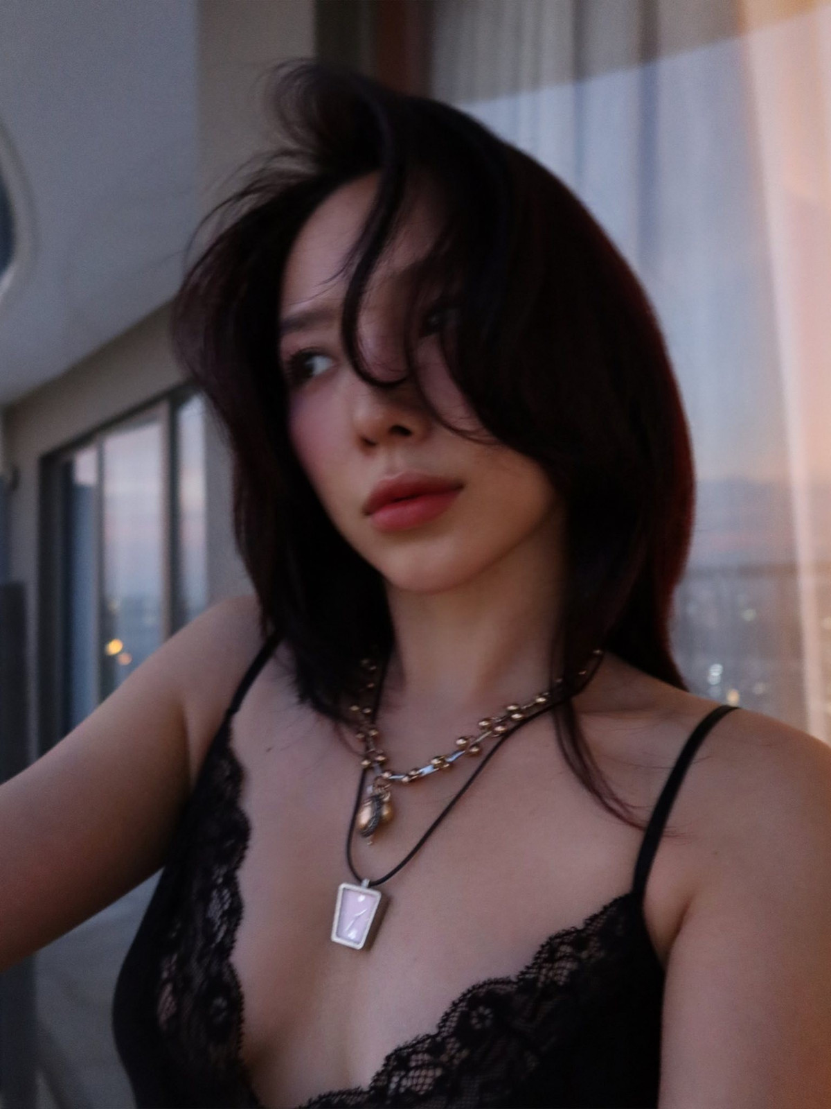 Trong khung hình, Tóc Tiên xuất hiện với diện mạo cuốn hút: mái tóc ngắn bồng bềnh, đôi mắt xa xăm và làn da sáng nổi bật giữa ánh chiều mờ ảo.
