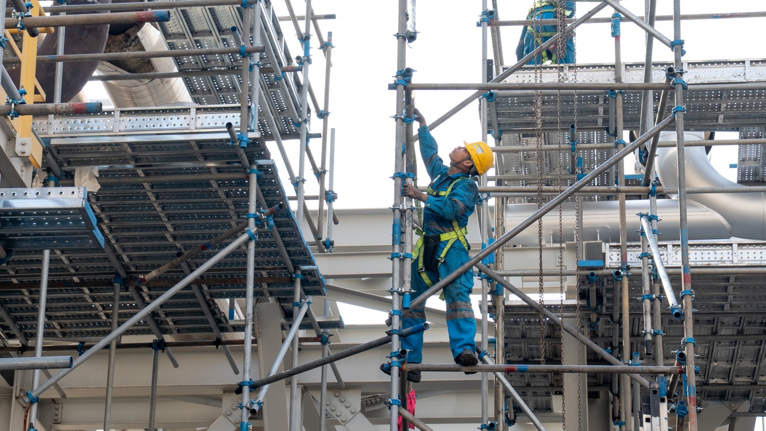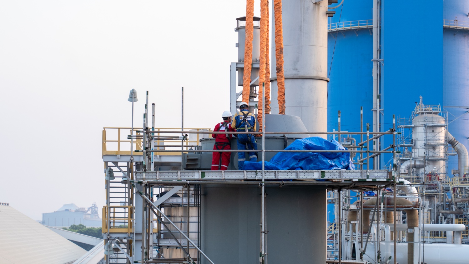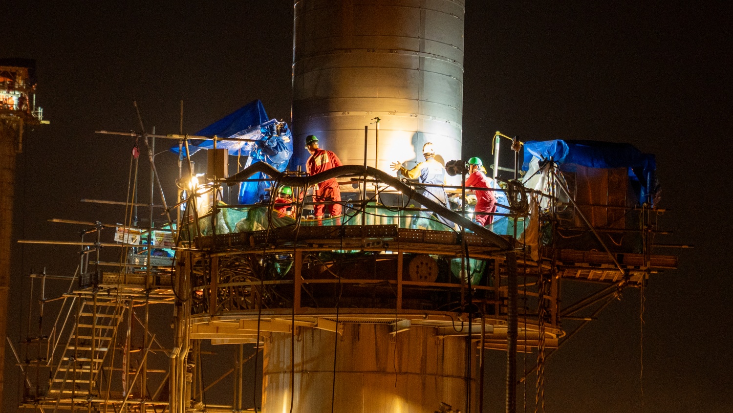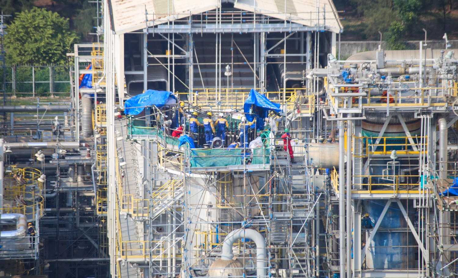 Sau khi cẩu giàn giáo ra khỏi vỏ thiết bị, nhà thầu chia các nhóm thi công để vệ sinh bu lông, bề mặt, dán lớp cao su bảo vệ bề mặt làm kín, vệ sinh khu vực đáy...