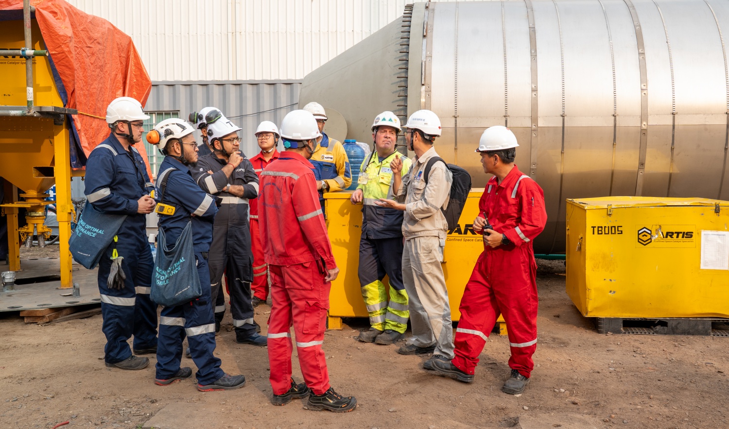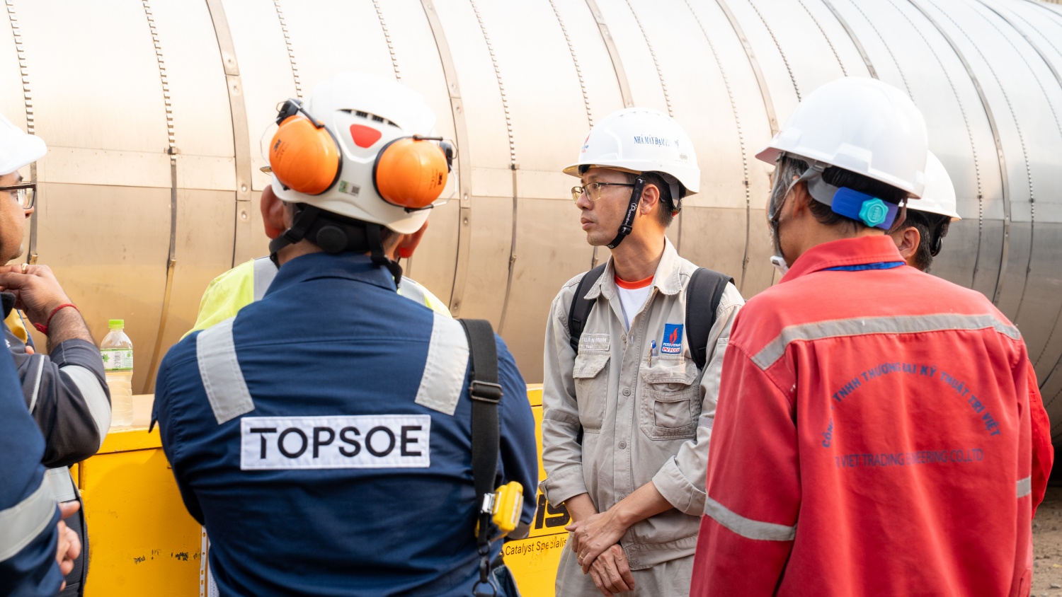 Các bên gồm: nhà thầu, nhà bản quyền, chủ đầu tư và đơn vị tư vấn họp ngay tại hiện trường để kiểm tra điều kiện lắp đặt. Trên cơ sở đáp ứng yêu cầu kỹ thuật, các bên thống nhất cẩu rọ xúc tác mới từ vỏ chứa sang vị trí lắp đặt trong chiều cùng ngày.