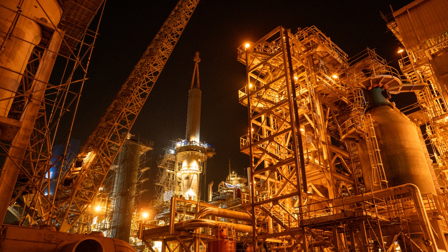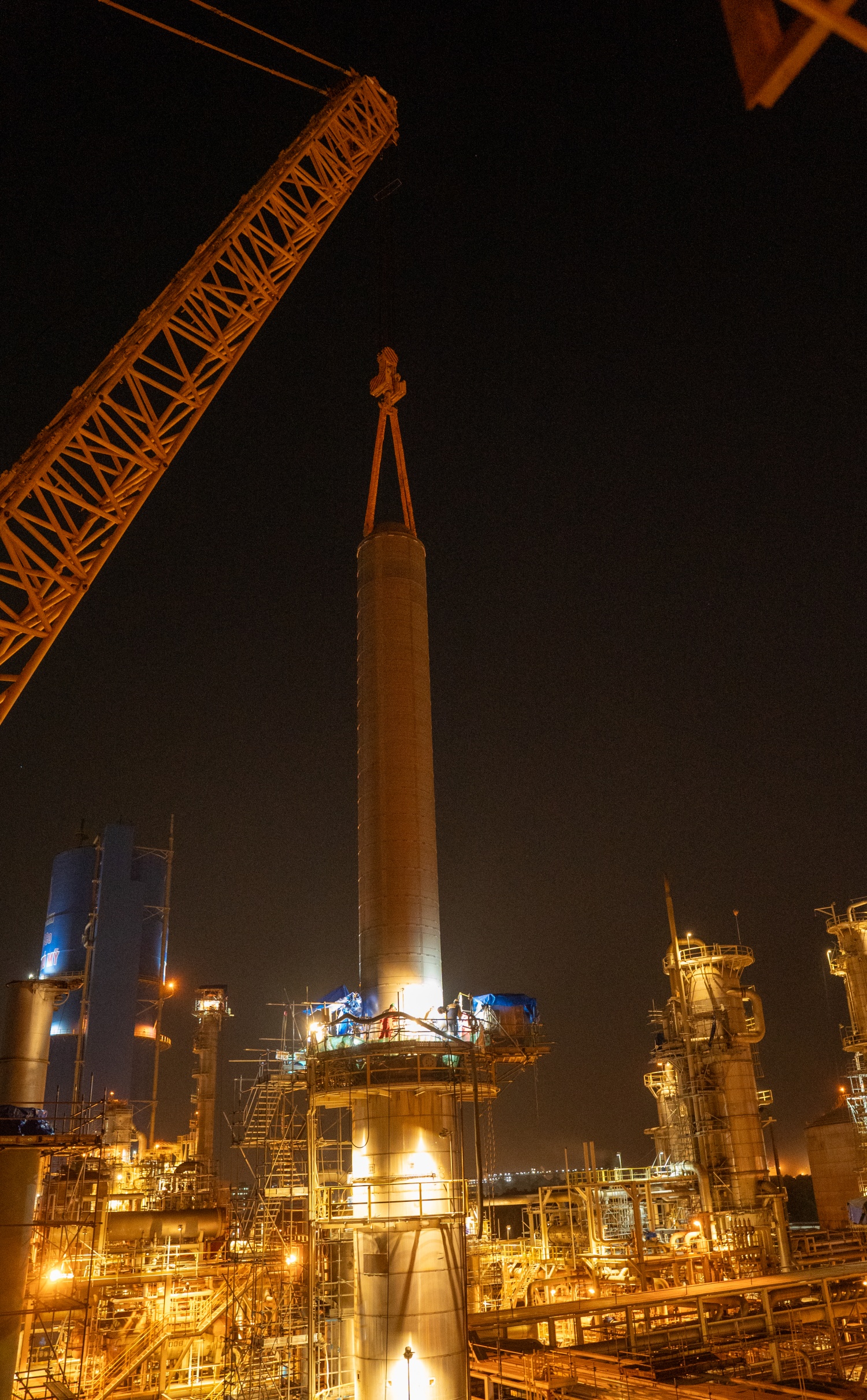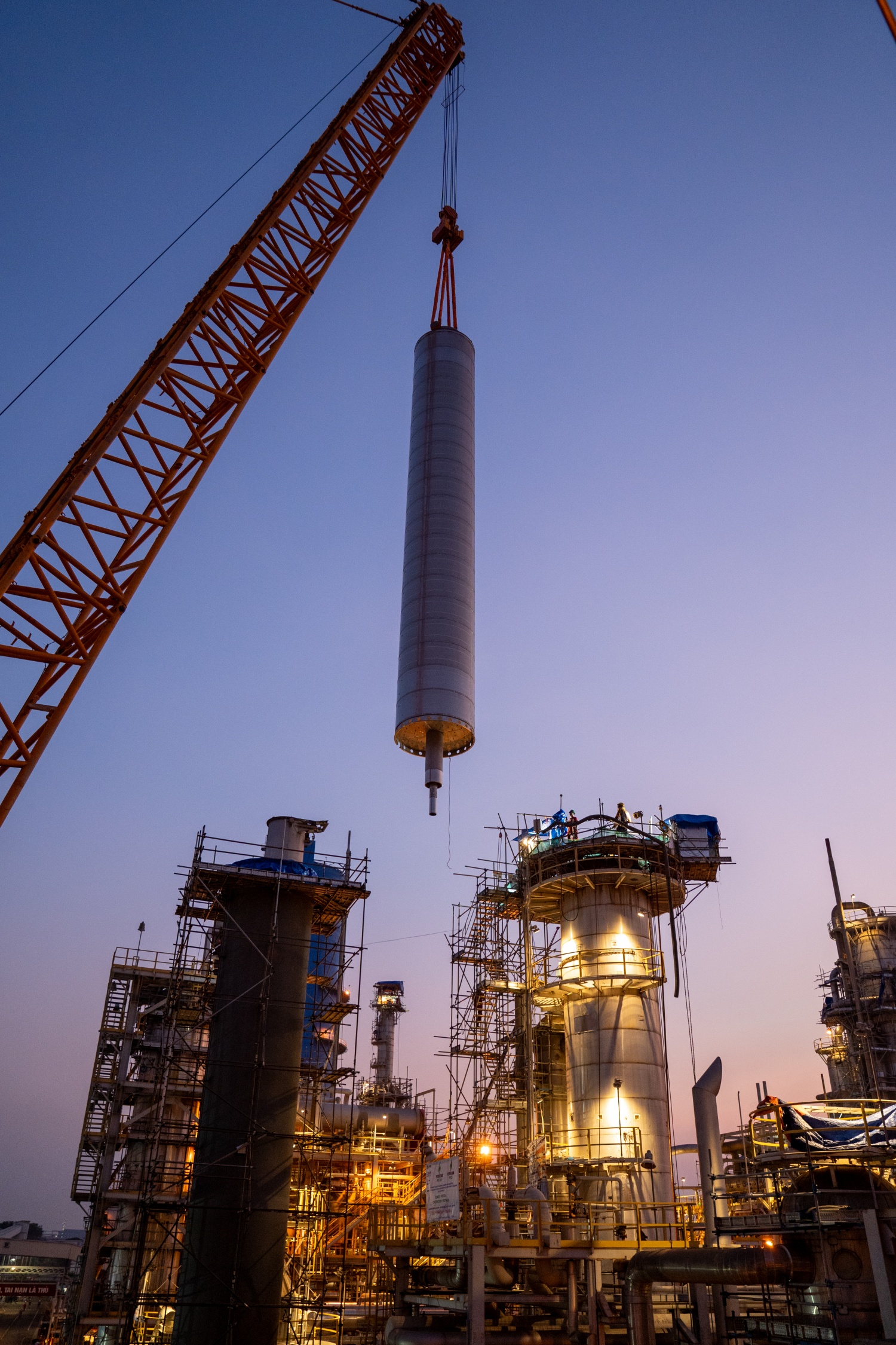 Rọ xúc tác nặng khoảng 86 tấn được cẩu nhấc từ từ, di chuyển sang vị trí vỏ thiết bị để cân chỉnh và lắp đặt.
