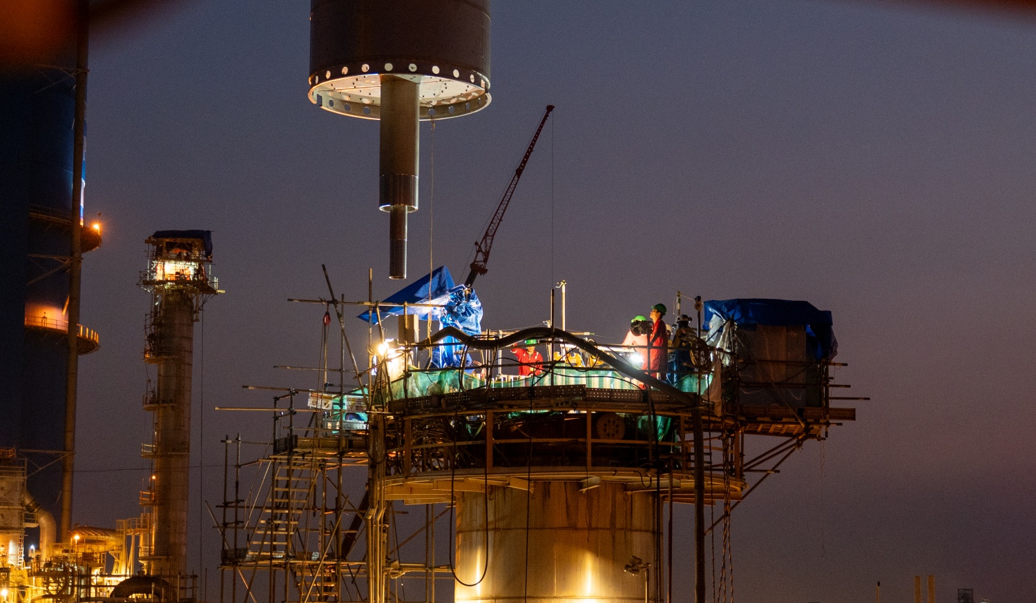 Hơn 14h ngày 10/1, giàn giáo bên trong vỏ thiết bị được cẩu ra để chuẩn bị cho công tác lắp rọ xúc tác.