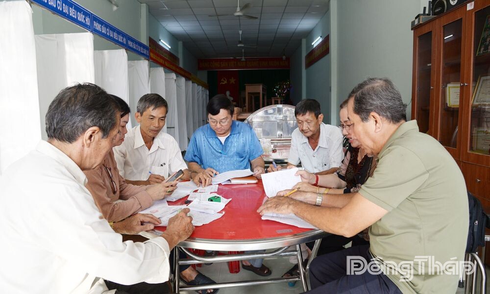 Tổ trưởng Tổ bầu cử cùng các thành viên tổ bầu cử khu vực bỏ phiếu số 22, phường Đạo Thạnh rà soát danh sách và thẻ cử tri, bảo đảm không bỏ sót cử tri đủ điều kiện tham gia bầu cử.