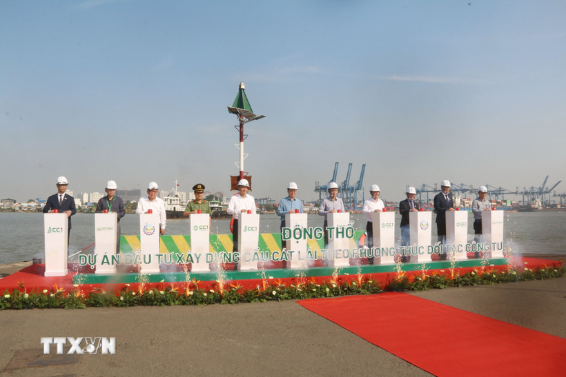 Các đại biểu thực hiện nghi thức động thổ cầu Cát Lái. (Ảnh: Công Phong/TTXVN)