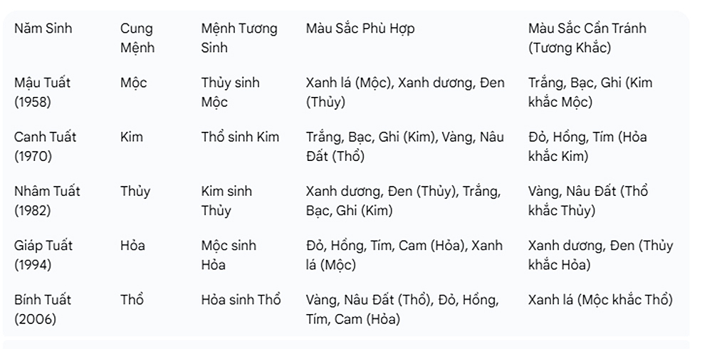Theo nguyên lý Ngũ hành, mỗi năm sinh tuổi Tuất sẽ tương ứng với một mệnh khác nhau. Việc chọn cây cần tuân thủ nguyên tắc tương sinh (mệnh hợp với mệnh cây) và tương hợp (mệnh cây là mệnh bản thân), đồng thời tránh các yếu tố tương khắc để không làm suy giảm vận khí.