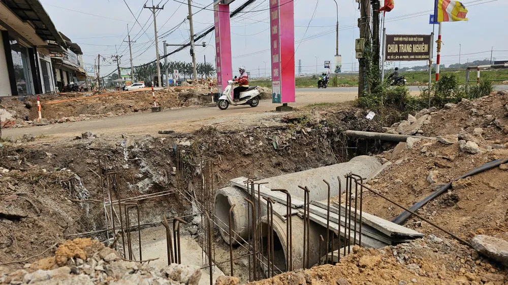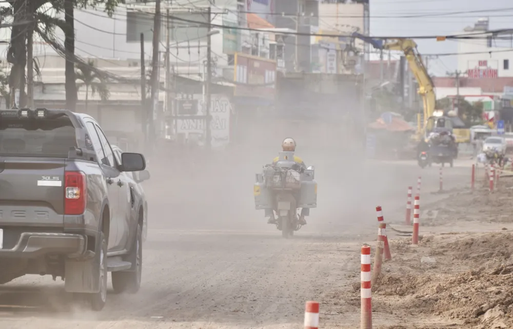 Đường Lê Duẩn là tuyến đường huyết mạch tại xã Long Thành nhưng quá trình thi công không rào chắn, bụi bay mù mịt mỗi lần xe chạy qua. Ảnh: VŨ HỘI