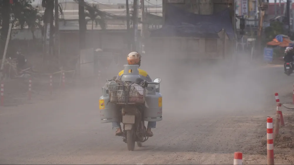 Rào chắn sơ sài, bụi bay mù mịt trên đường.