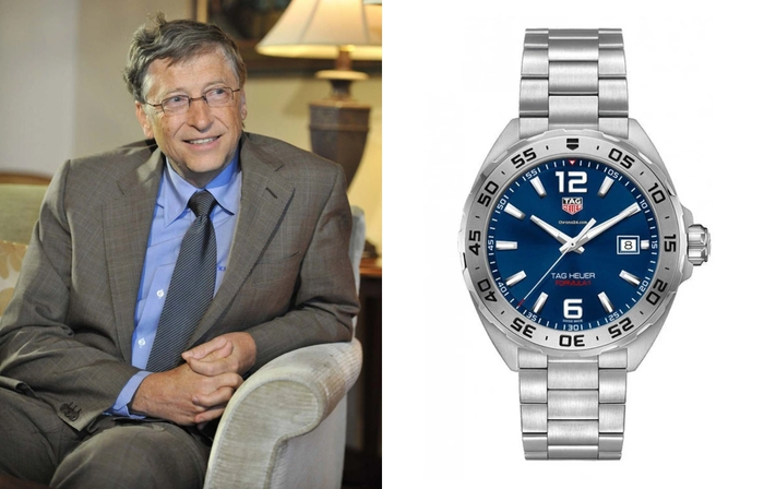 Mẫu đắt nhất của tỷ phú Bill Gates là Tag Heuer Professional 2000, giá 1.400 USD. Vỏ và dây thép không gỉ, mặt xanh lam, kim phát sáng, bezel xoay một chiều lấy cảm hứng F1, chống nước 200 m.